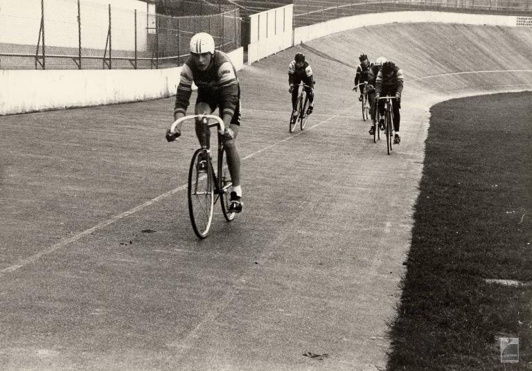 Archives municipales de Lorient 5 Fi 11463 - Cinq cyclistes en plein effort sur la piste du Moustoir (1999)