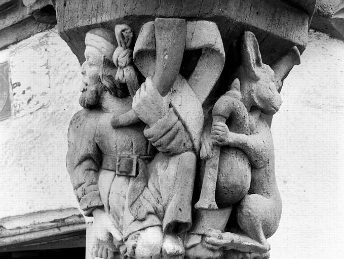 Malestroit. Maison de la truie qui file. Angle de façades, sous corniche, élément de poutre en bois sculpté : homme avec un cor et animal jouant de la veuze. Photographie, par Eugène Lefèvre-Pontalis, [s. d.].