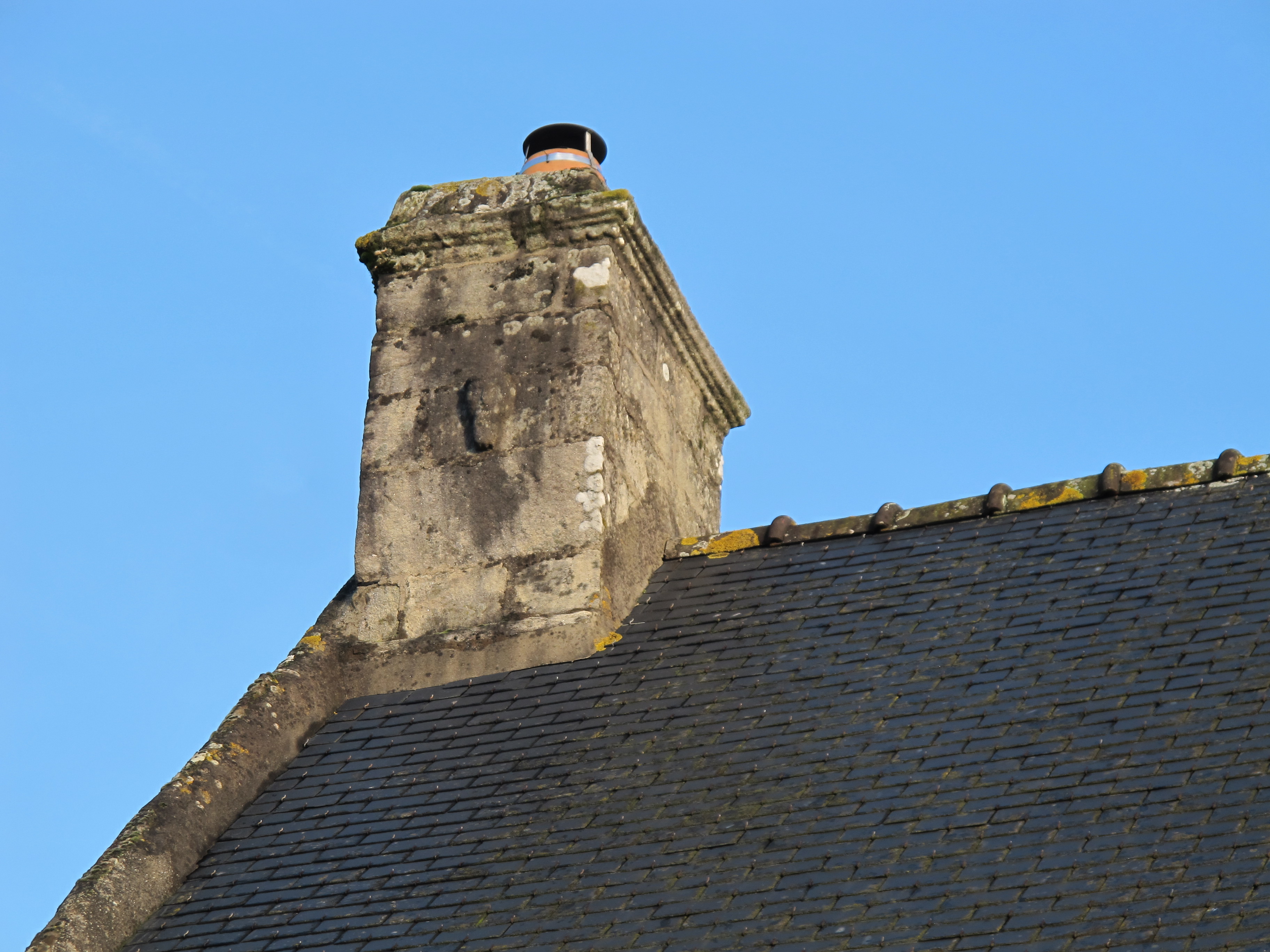 Ferme (parcelle ZO26) datée 1653, détail de la souche de cheminée ornée d'une tête en remploi, état en 2015Immatriculation