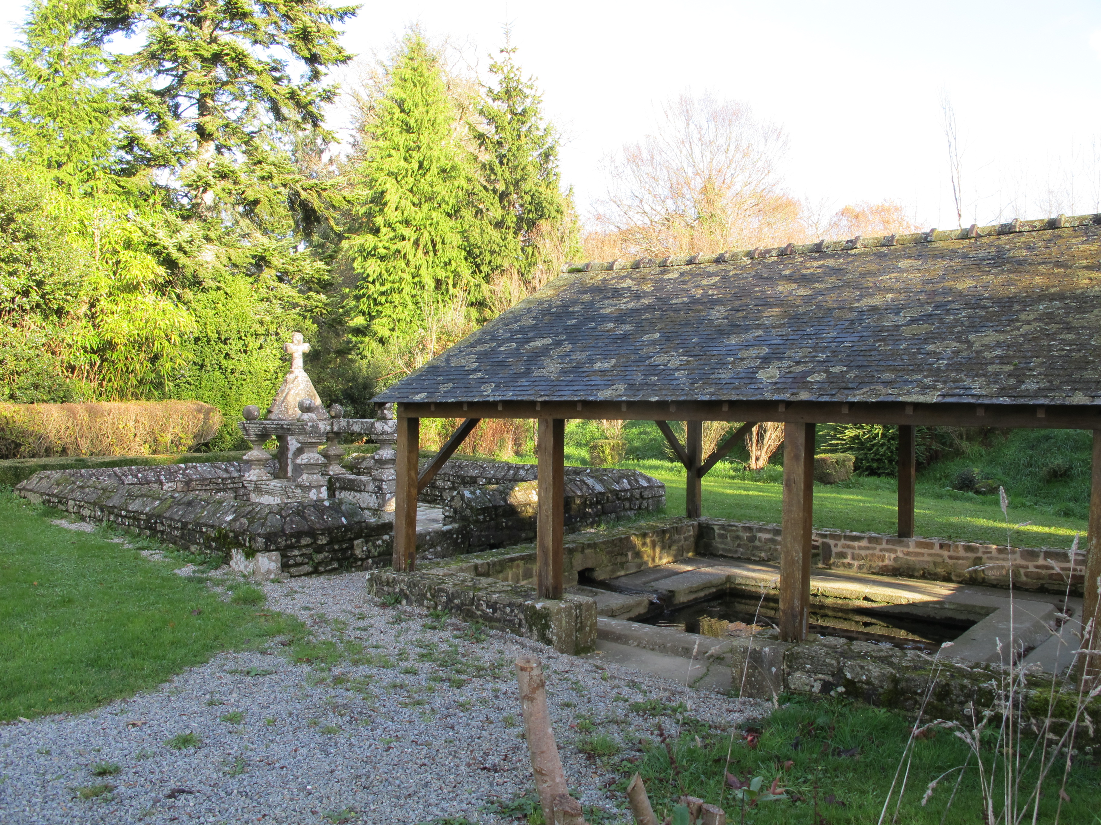 Vue générale sud-ouest de la fontaine et du lavoir couvert, état en 2015Immatriculation