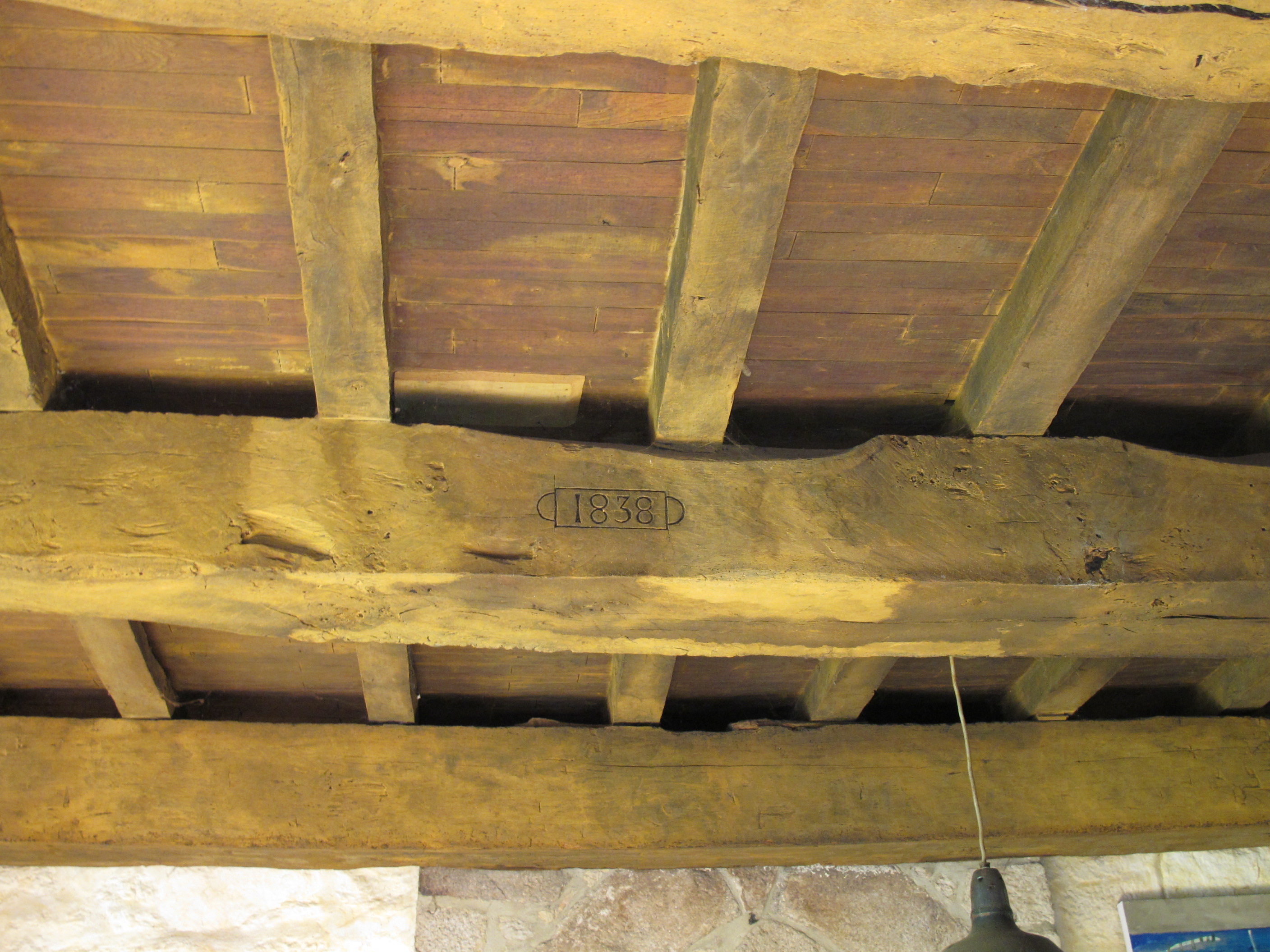 Chambre basse, détail de la poutre datée 1838, état en 2015Immatriculation