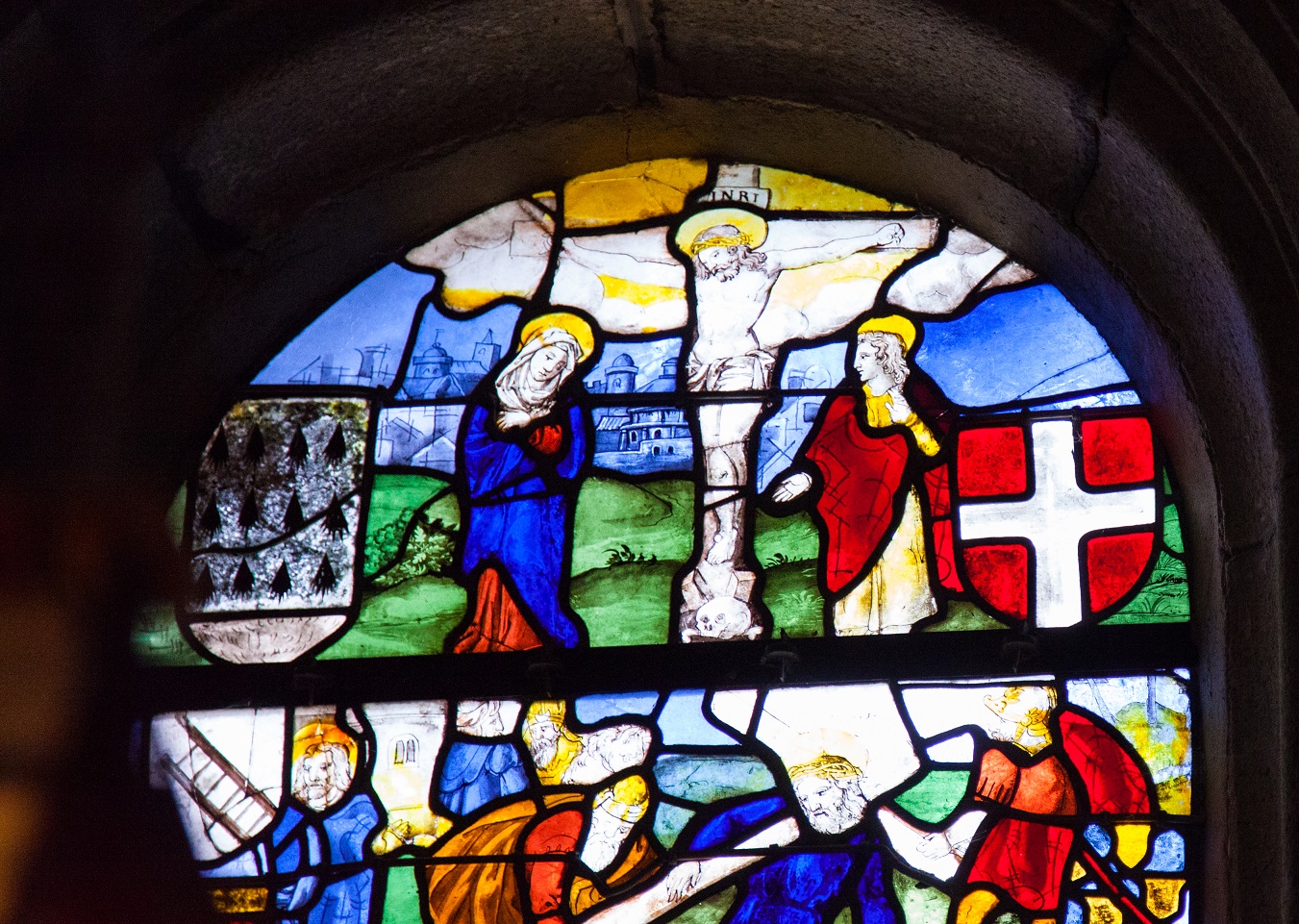 Vitrail de la baie 0, crucufixion et blason de Bretagne et de Malte, Eglise Saint-Jean-Baptiste, Le GuernoImmatriculation
