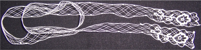 Lacet en mailles losanges et filet irrégulier. Ce lacet se positionne au ras de la visagière et enserre le fond de la coiffe pour venir se nouer au bas de celle-ci au-dessus de la nuque. Collection Michel Rocher. Photo Ijin.Immatriculation