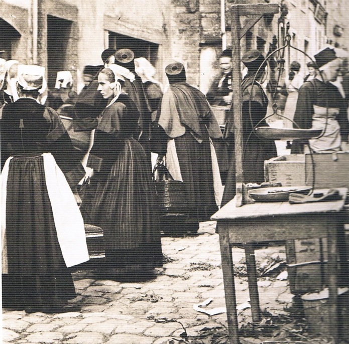 Sur le marché du Faouët, on remarque les différentes coiffes qui se portaient dans la région à l’époque. (Extrait d’une photographie de Charles Lhermite 1913).Immatriculation