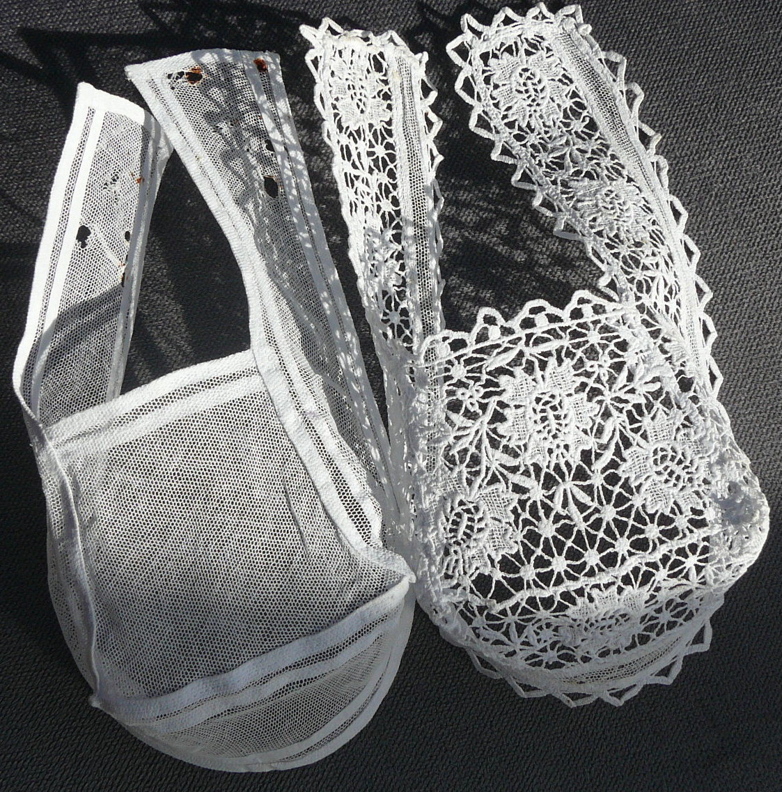 Coiffe du XXe siècle. Deux petites coiffes, l’une sans doute portée par Francine, la fille de Mme Le Toullec, lors de sa 1re communion en 1932. (Collection particulière d'Yvonne Olivier)Immatriculation