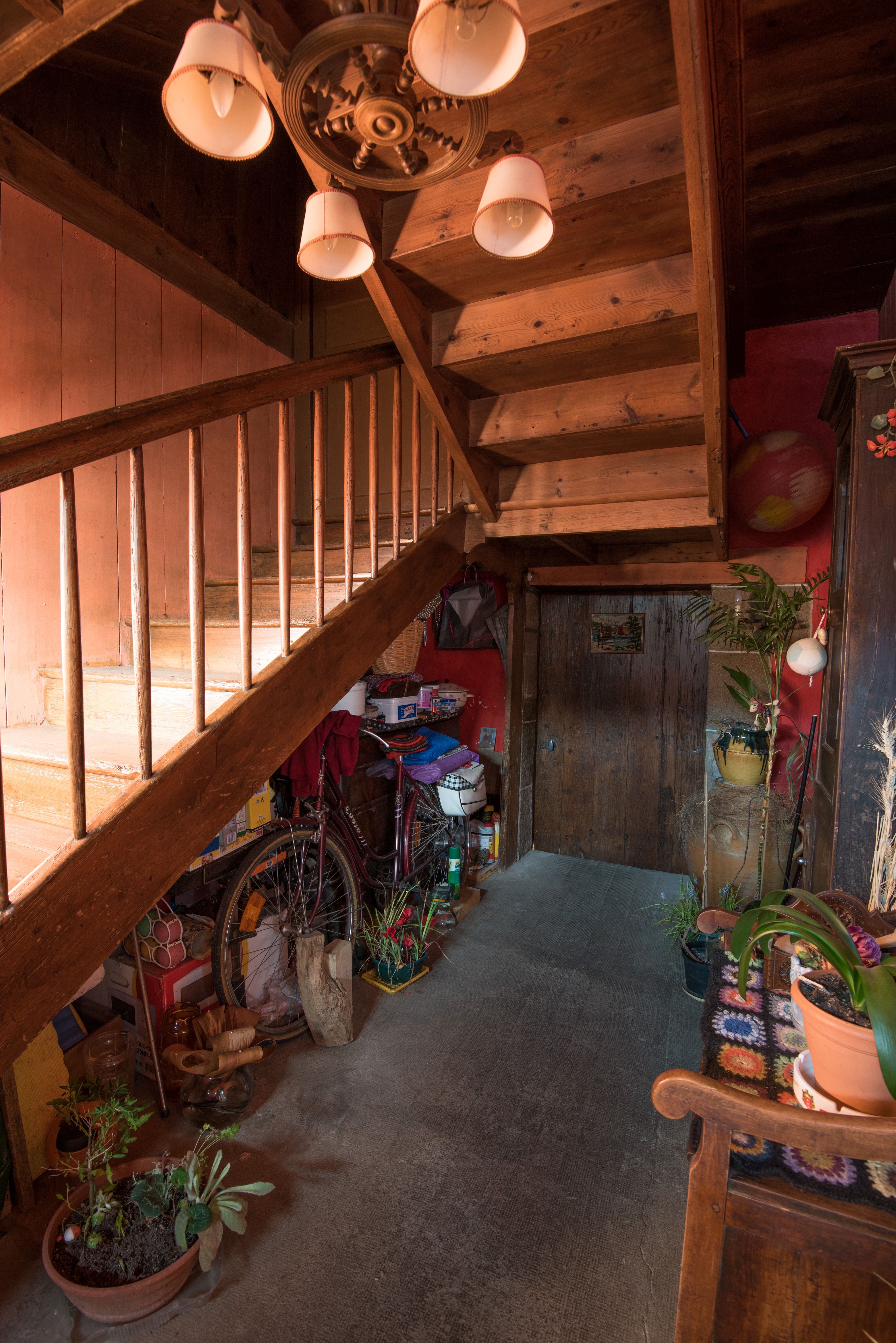 Couloir d'entrée. Escalier et porte d'accès à l'appentis nordImmatriculation