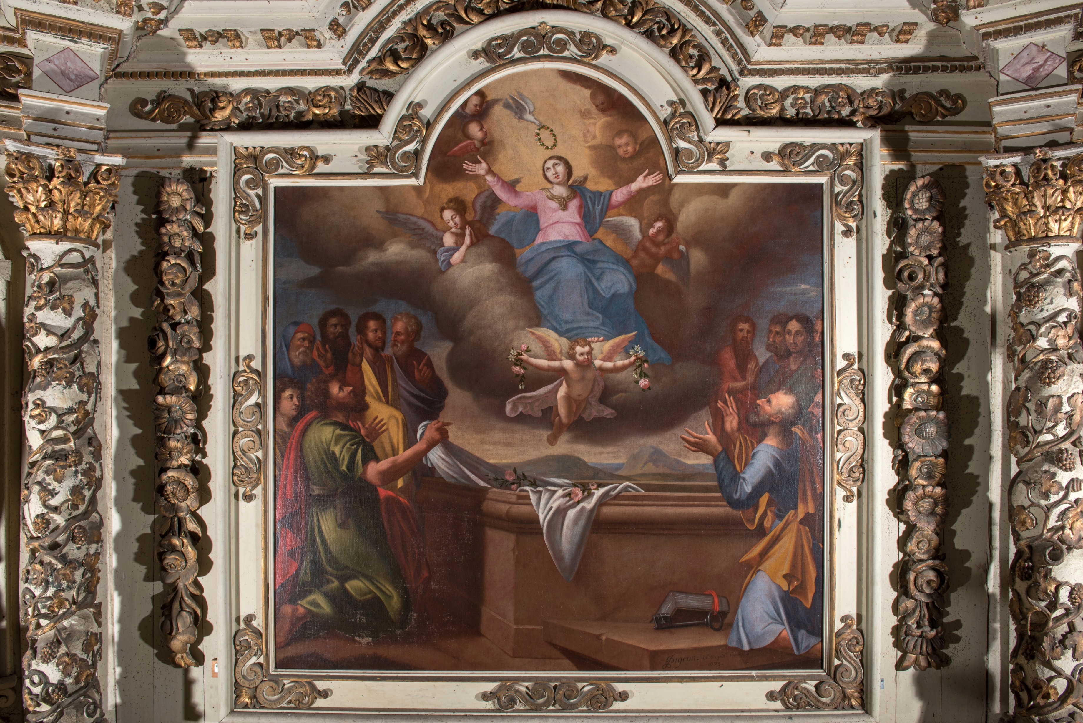 Grand retable du choeur provenant de Runan, bois polychrome, 1727 (classé M.H.). Tableau du maître-autel : l'Assomption de la Vierge. Vue généraleImmatriculation