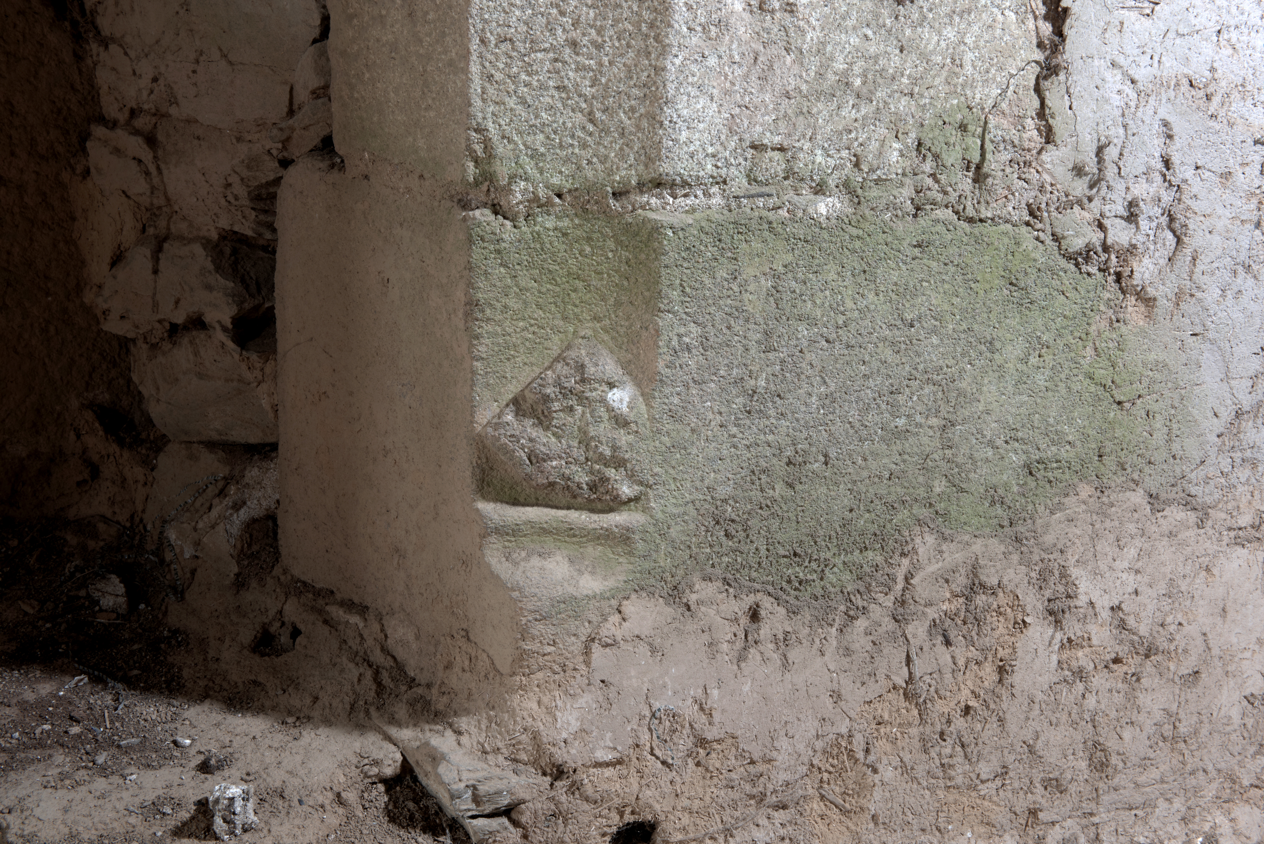 Cheminée de la salle de guet. Base d'un piédroit. Détail d'un blason aux armes des Coëtgoureden : de gueules à la croix endentée d'argentImmatriculation