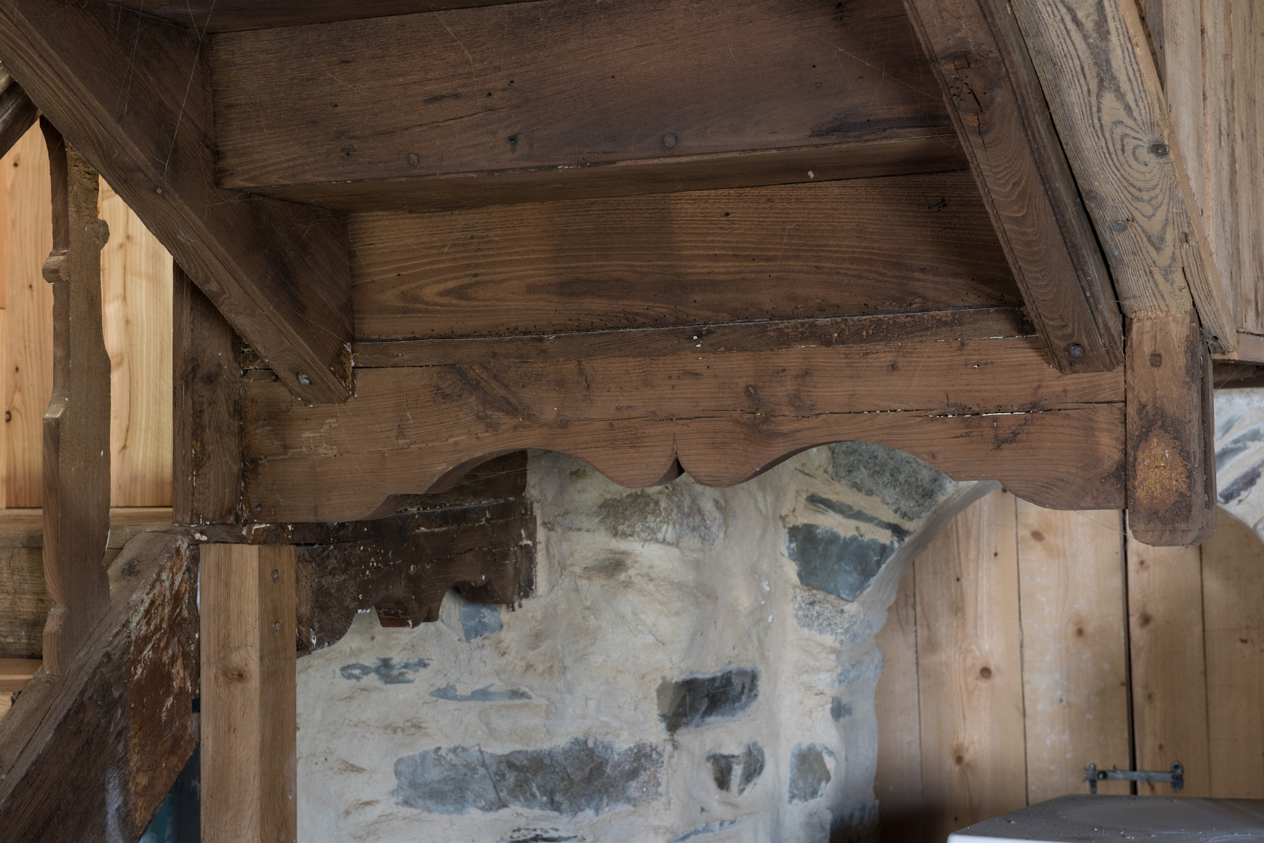 Escalier dans oeuvre. Détails de pièces de bois chantournéesImmatriculation