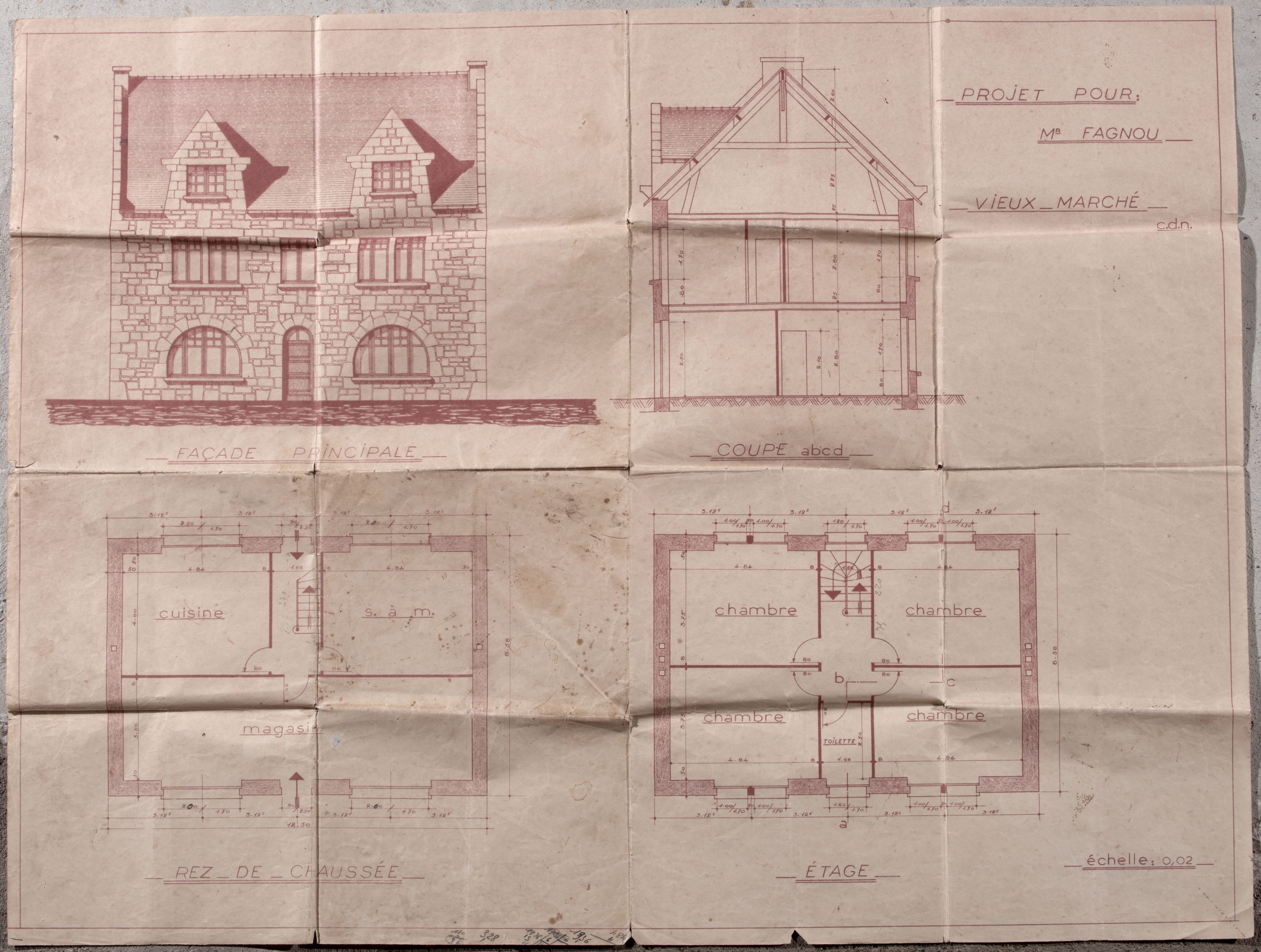 Maison du patron teilleur de Moulin Neuf. Plan, élévation et coupe (1953)Immatriculation