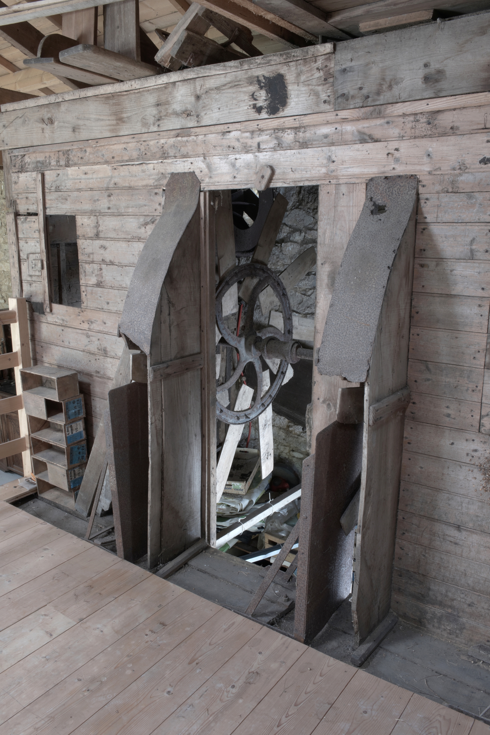 Teilleuse. Détail d'une trappe ouverte entre deux postes de travail. Axe de rotation avec spatules en arrière planImmatriculation