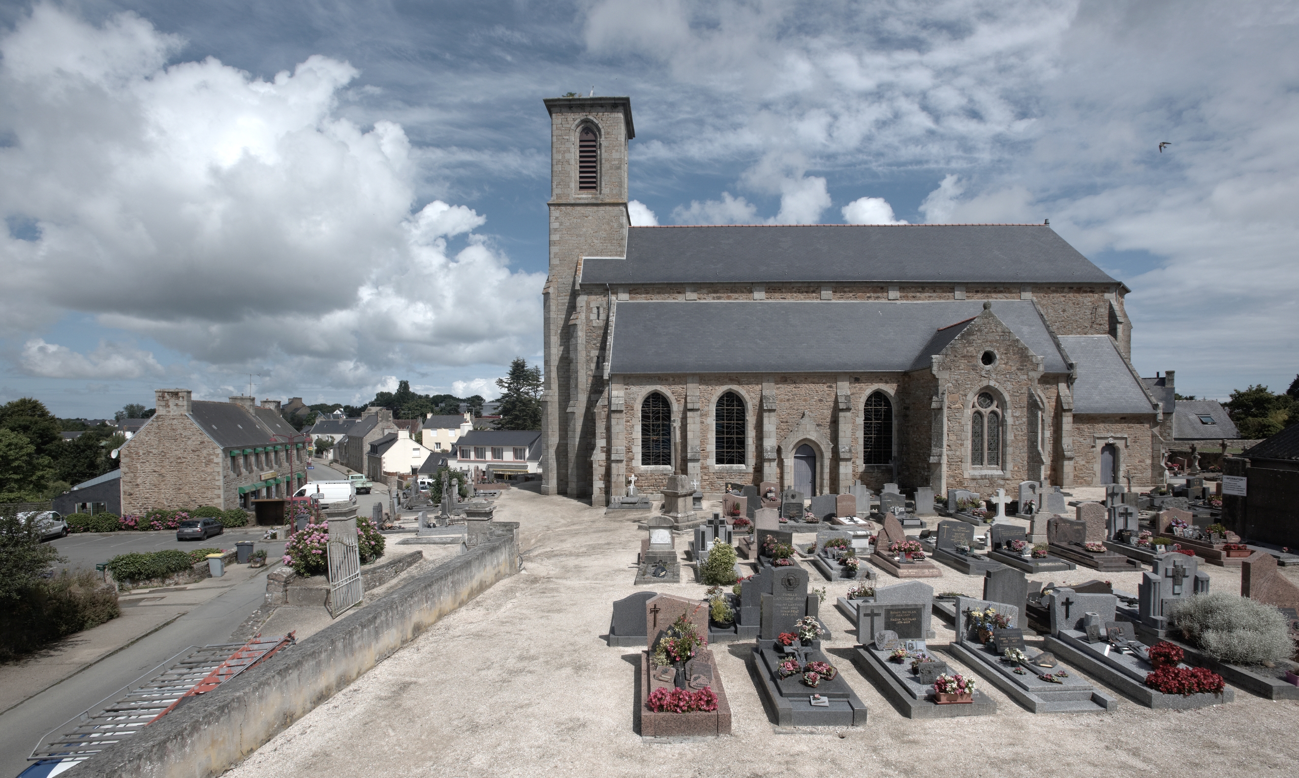 Kermaria-Sulard : église paroissiale Notre-Dame-de-la-Joie et son cimetière, vue générale depuis le sudImmatriculation