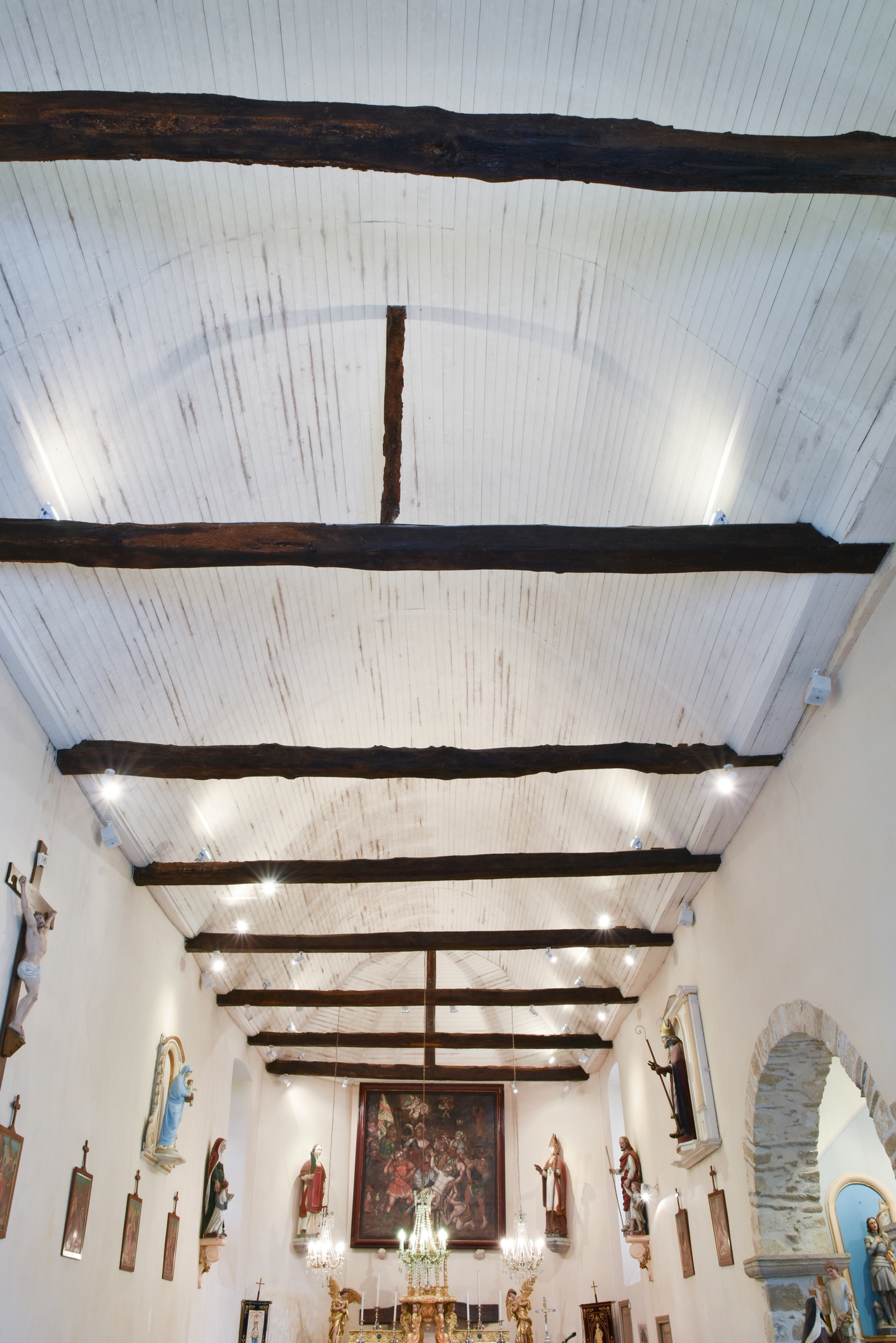 Vue de la charpente lambrissée enduite au lait de chauxImmatriculation