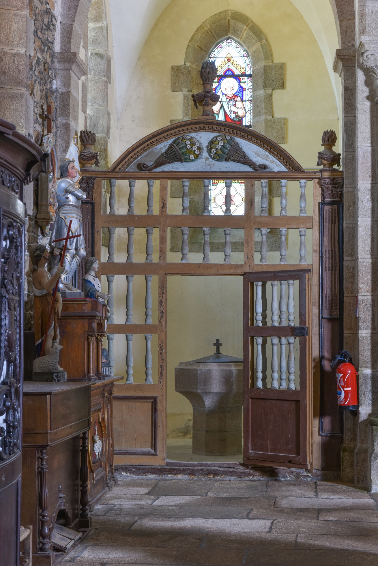 Église paroissiale Saint-Trémeur (Camlez) - chapelle sud. Fonts baptismaux. Vue générale.Immatriculation
