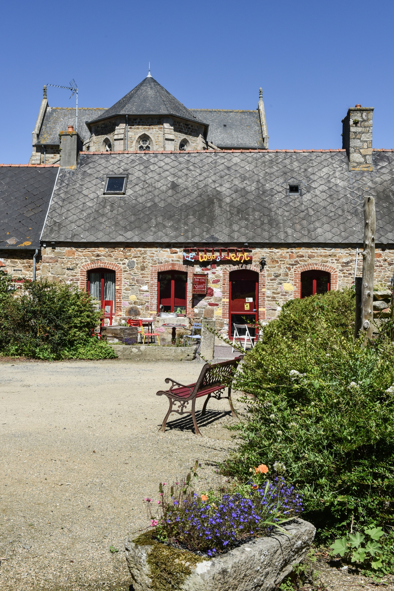 Camlez, le bourg : école des filles, maison d'habitation derrière l'église. Vue générale nord.Immatriculation
