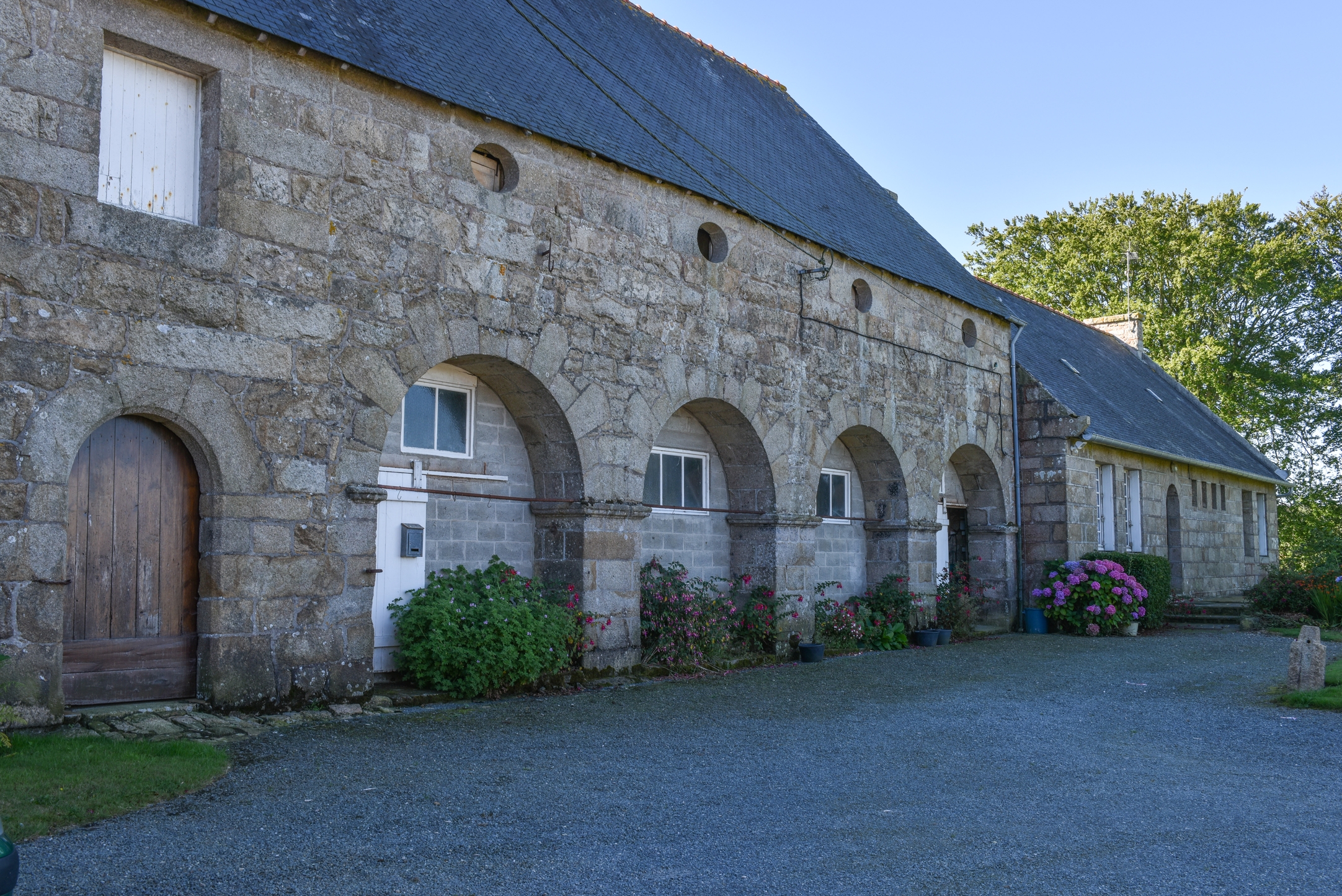 Château de Kerham (Camlez) - Camlez, Kerham : remise ouest, la galerie servant de remise comprend quatre arcades en plein cintreImmatriculation
