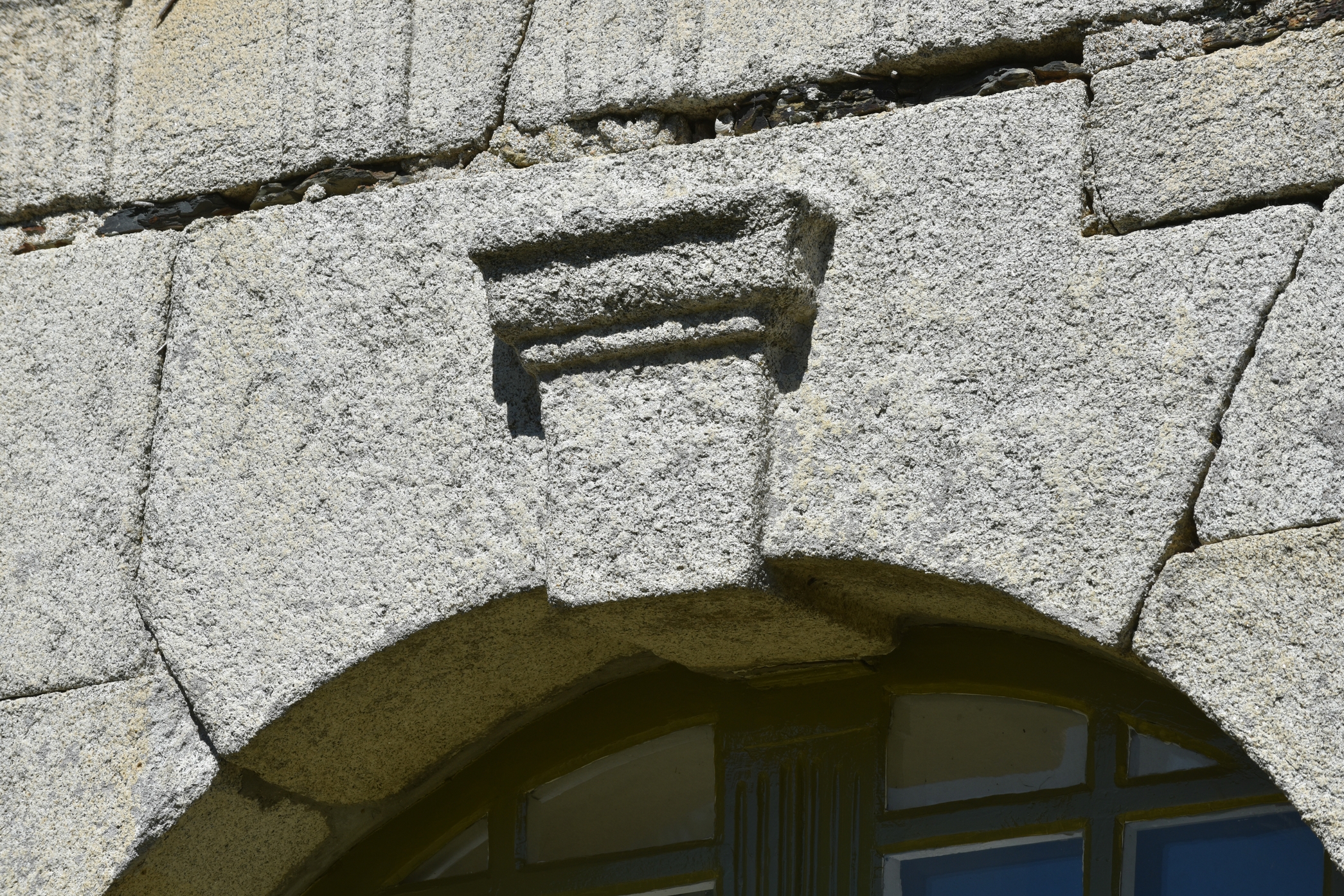 Le logis de Trostang (Camlez) - Façade sud. Portail monumental. Détail de la clef de l'arc.Immatriculation