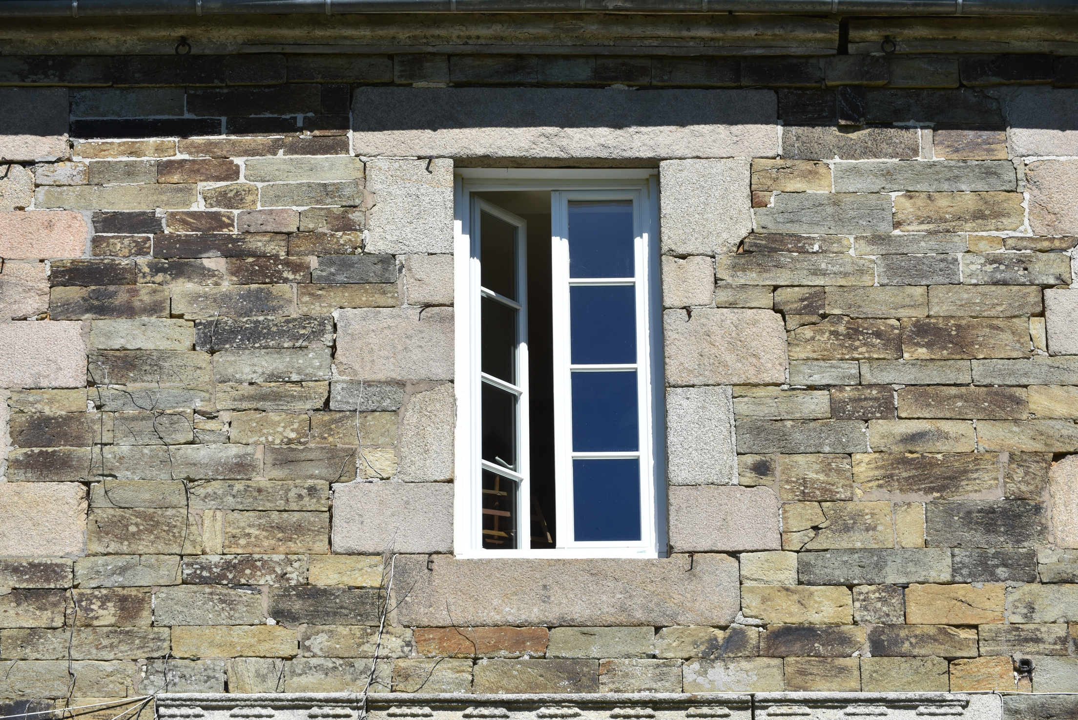 Le logis de Trostang (Camlez) - Façade sud. Détail d'une fenêtre.Immatriculation