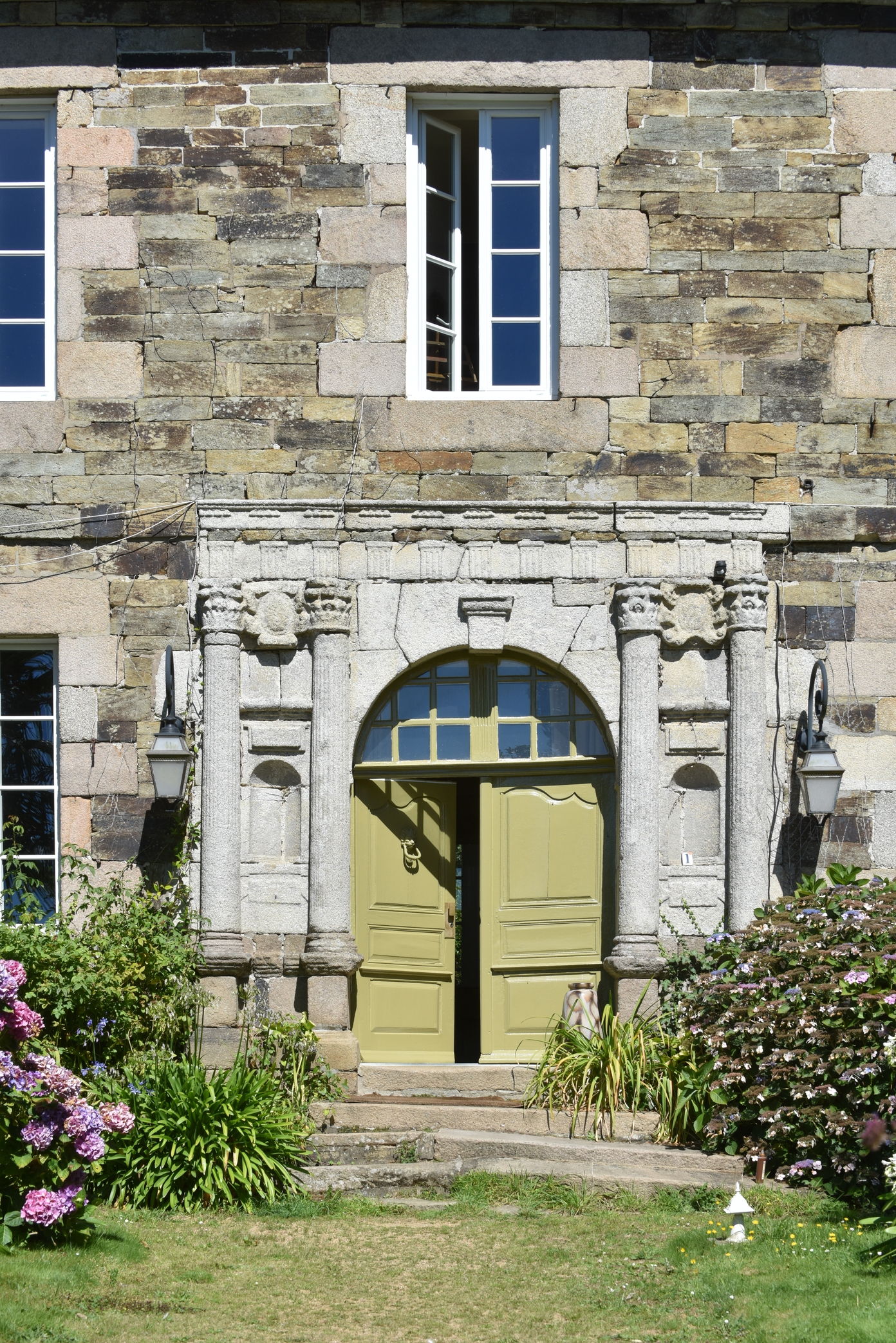 Le logis de Trostang (Camlez) - Façade sud. Détail de la travée centrale.Immatriculation