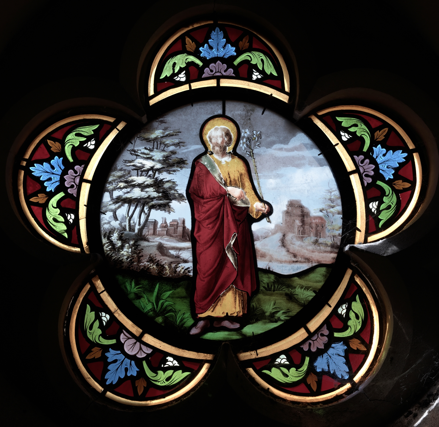 Vitrail d'une chapelle rayonnante, Joseph tenant dans une main une fleur de lysImmatriculation
