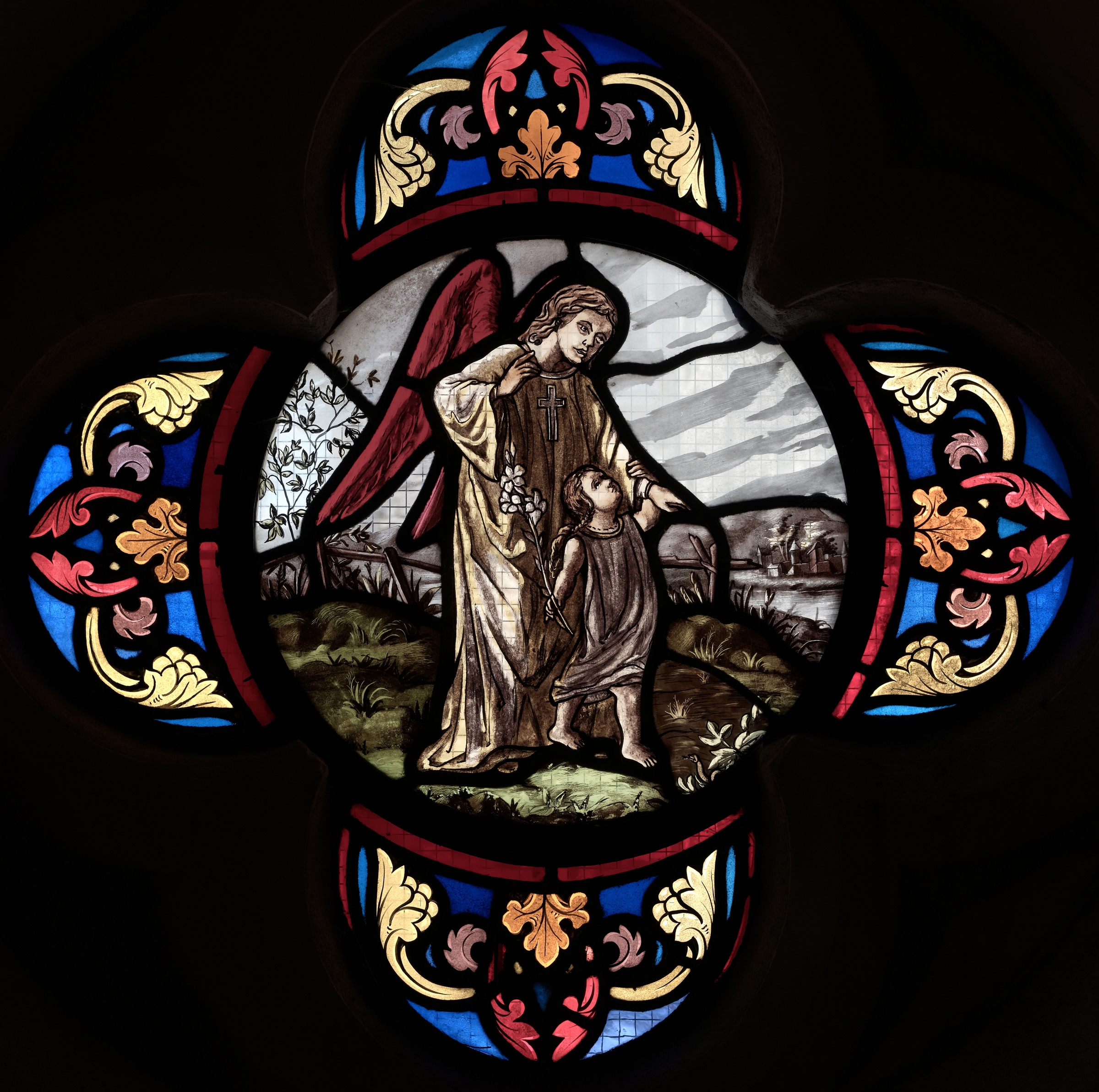 Vitrail d'une chapelle rayonnante, représentation d'un ange avec un enfantImmatriculation