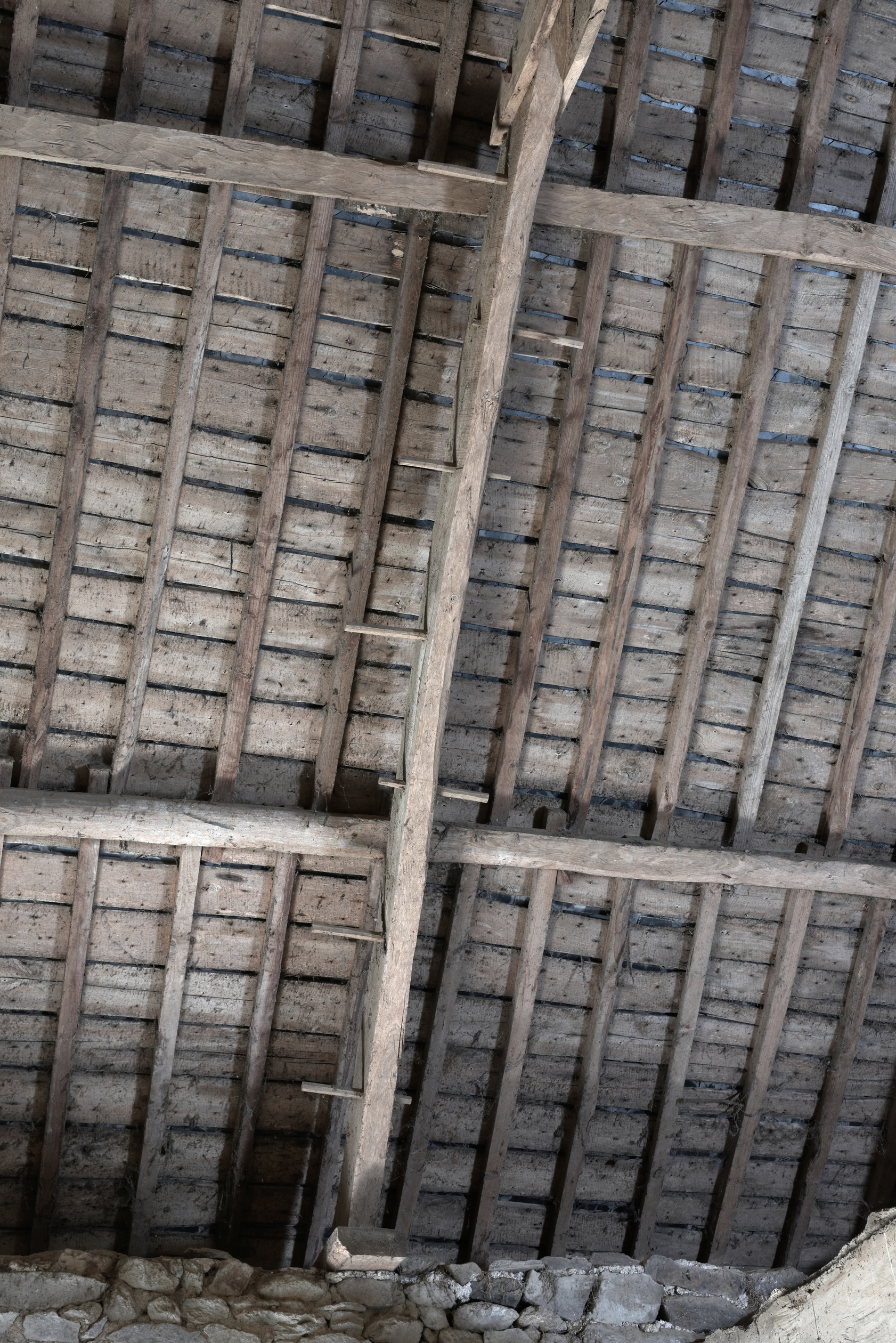 Dépendance accolée au logis, détail de la charpente, les arbalétriers sont perforés pour y placer des chevilles servant de marches lors de la pose des pannesImmatriculation