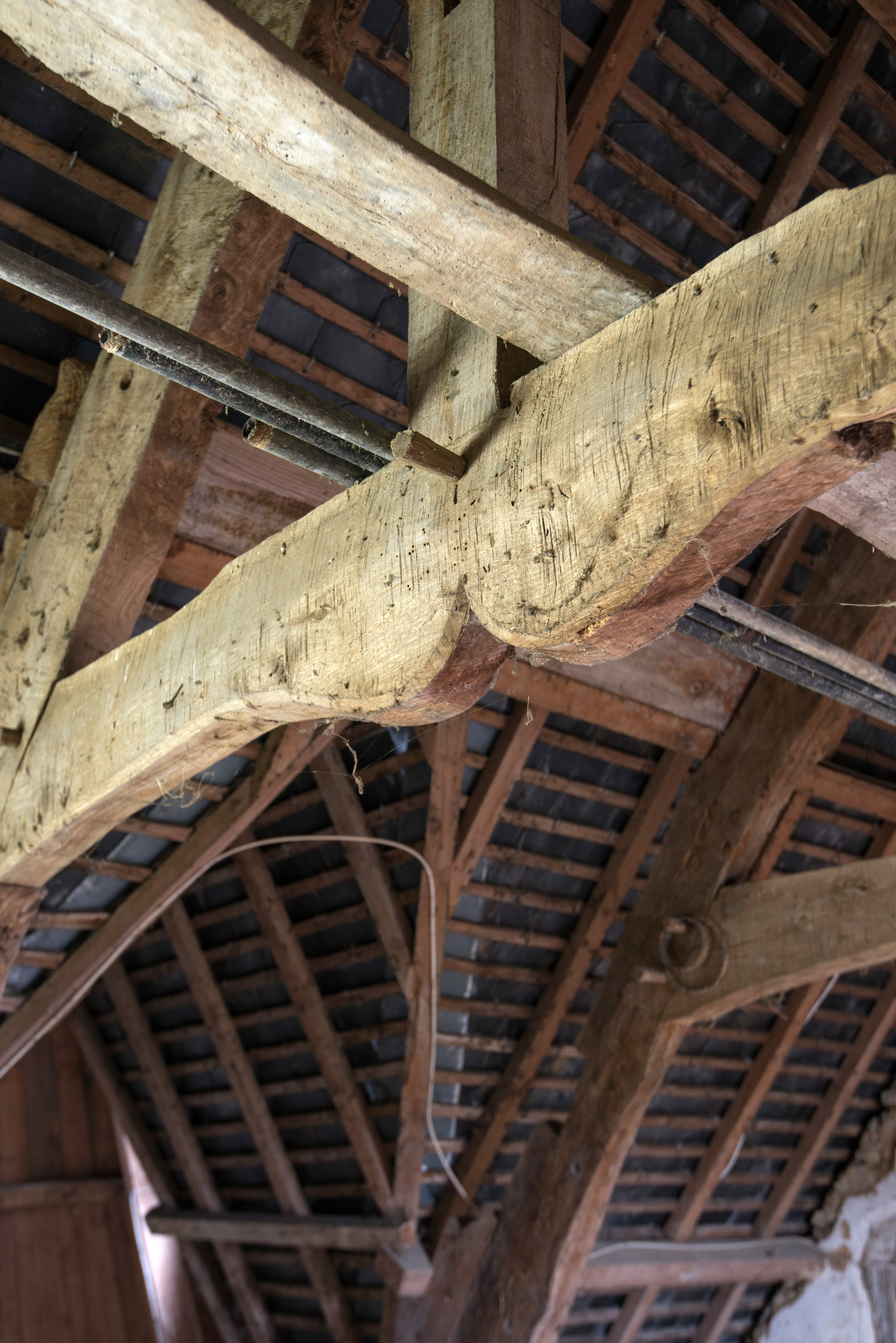 Langoat, Le Cosquer : manoir puis ferme, combles et charpente ancienne, détail de l'un des deux entraits ornés d'une accolade de style gothiqueImmatriculation
