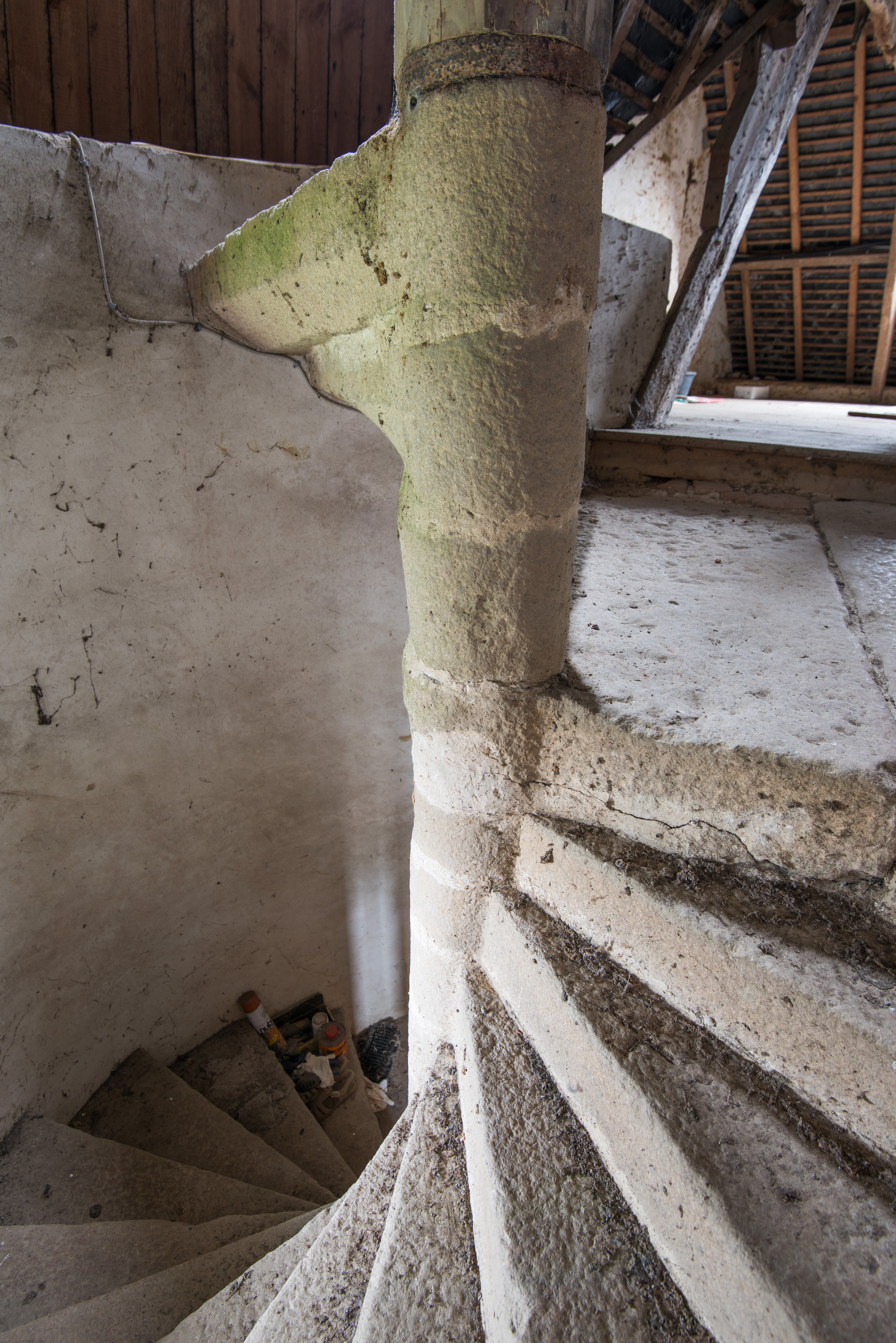 Langoat, Le Cosquer : manoir puis ferme, détail de l'escalier en vis. Les trois marches "en attente" montrent que la tour d'escalier a été en partie arasée (pièce haute disparue ?)Immatriculation