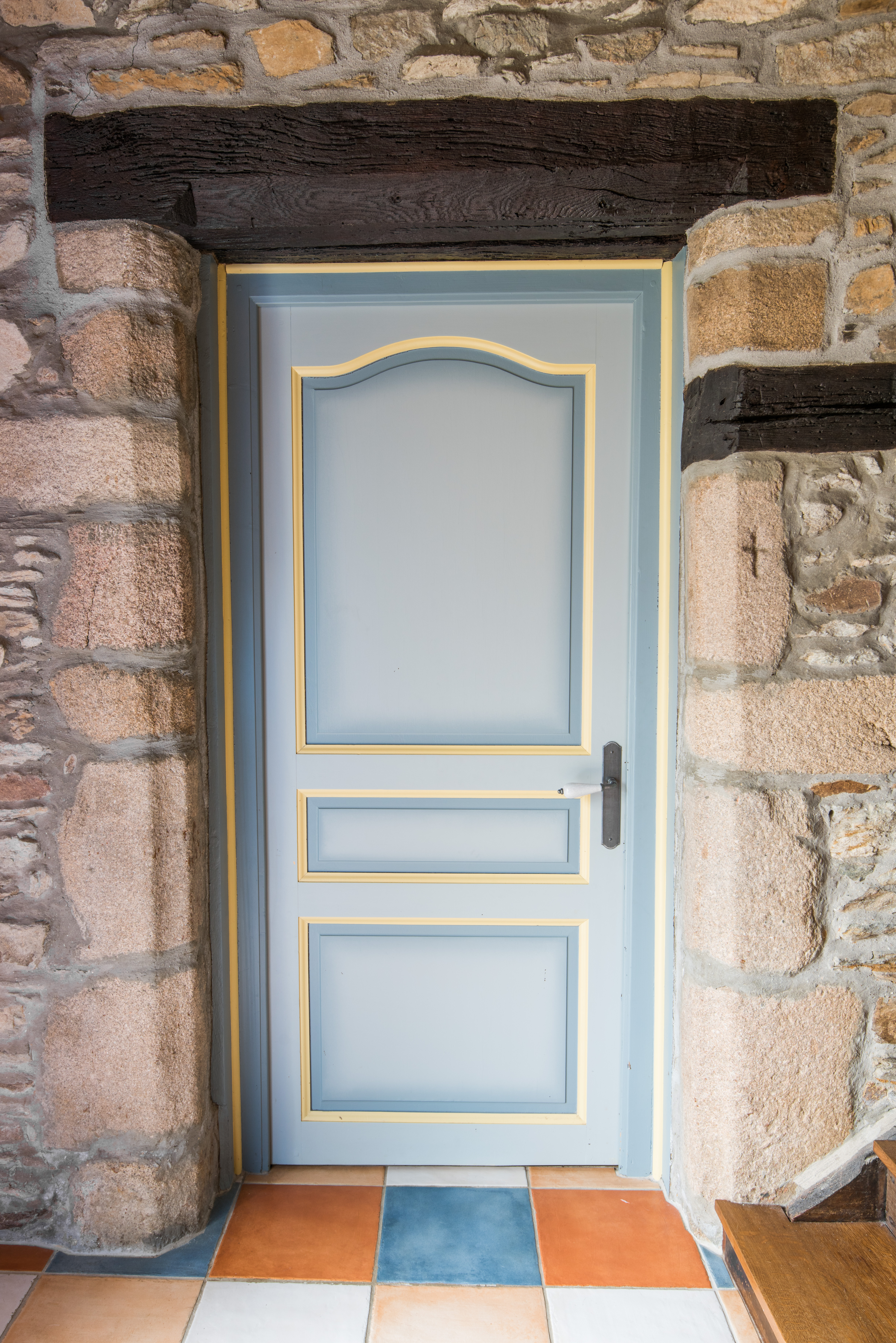 Vestibule d'entrée. Mur de refand. Détail de la porte chanfreinée du 15e siècle avec petite croix gravée dans la pierreImmatriculation