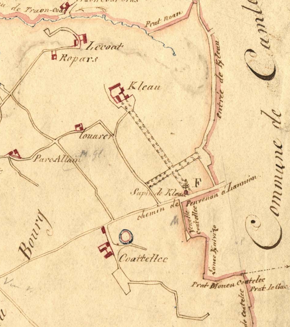 Tableau d'assemblage du cadastre ancien de la commune de Kermaria-Sulard, 1819 : site du manoir de Kerleau. On peut observer l'allée cavalière qui mène au logisImmatriculation
