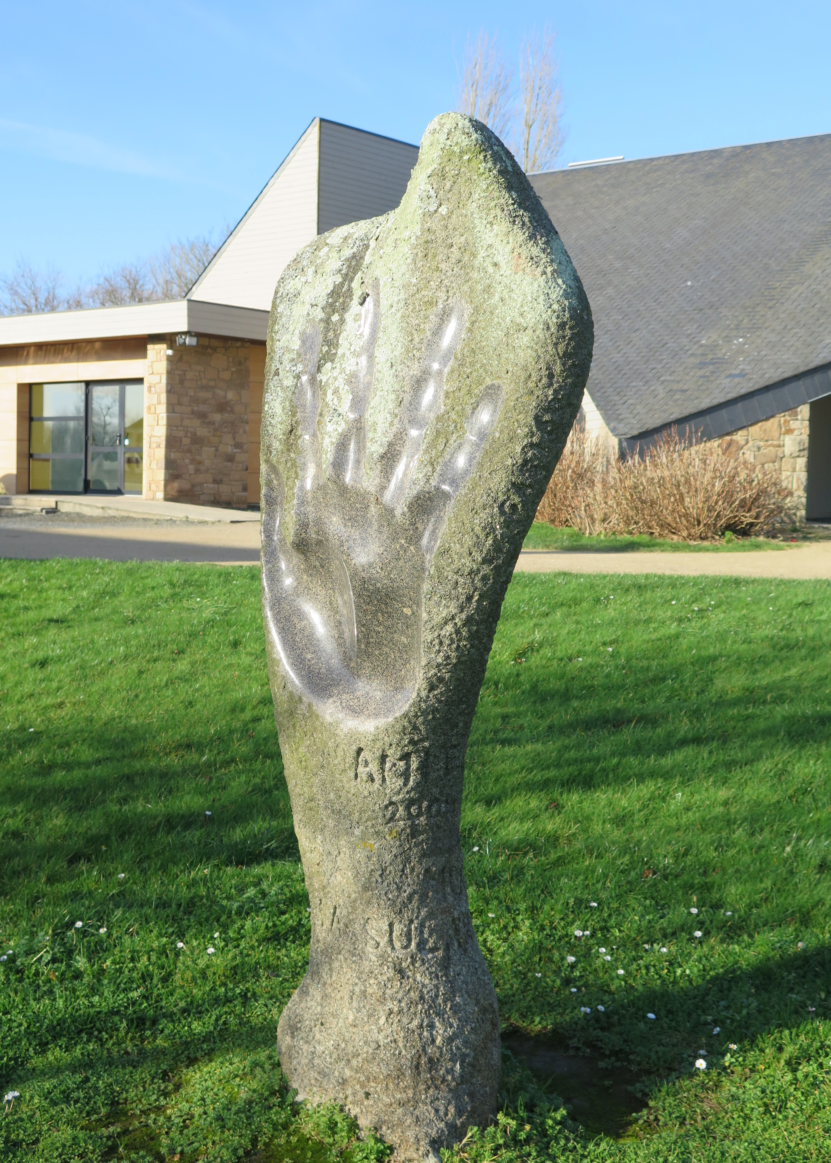 Kermaria-Sulard, le bourg : "Amitié", sculpture contemporaine de Kazig Gasior. Cette oeuvre marque les cérémonies du dixième anniversaire du jumelage Kermaria-Sulard - Muhlbach en AlsaceImmatriculation