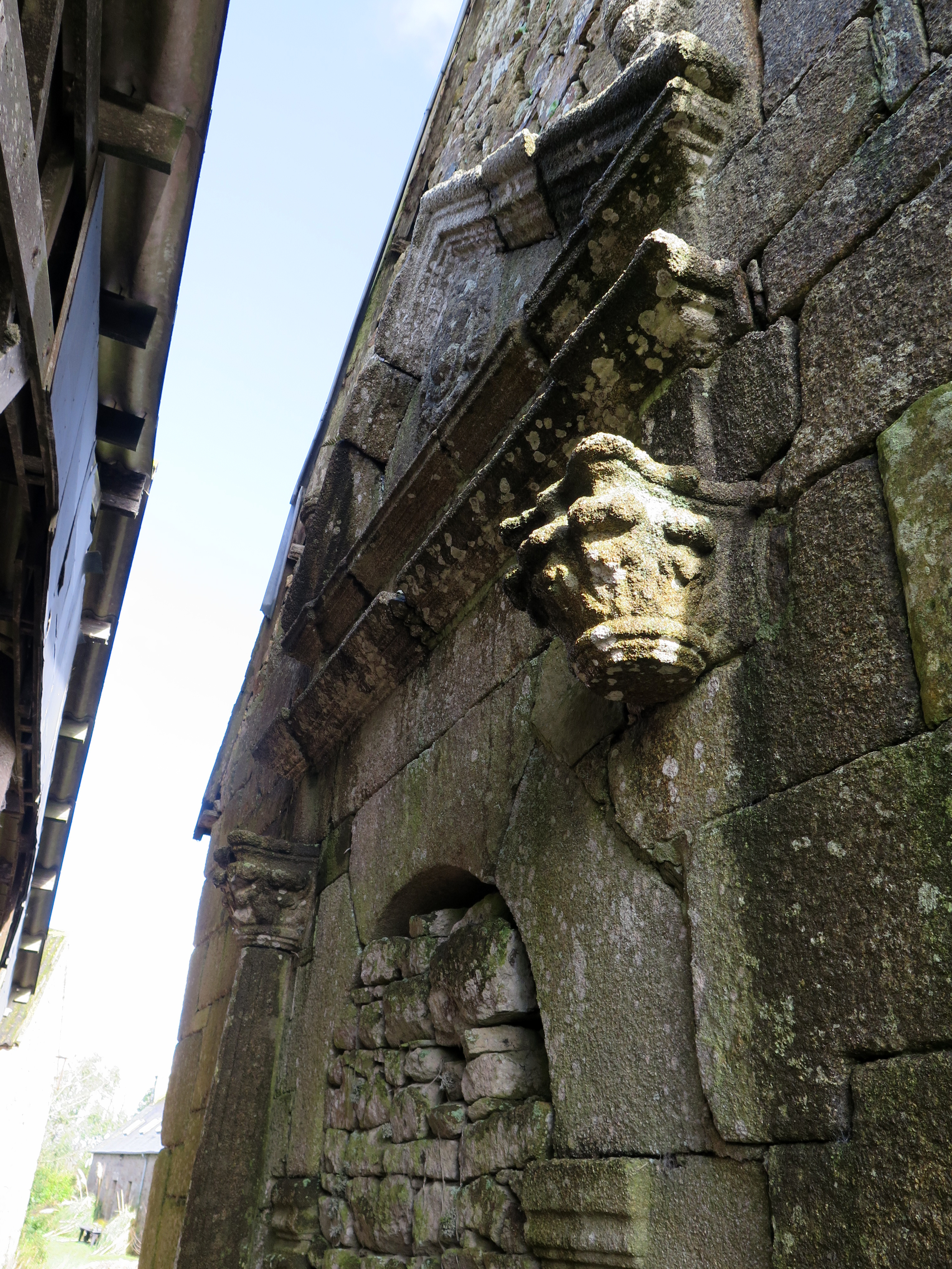 Kermaria-Sulard : chapelle de Kerleau, élévation ouest, entrée surmontée d'un fronton triangulaire et encadrée par deux colonnes (l'une d'entre elles a disparu)Immatriculation