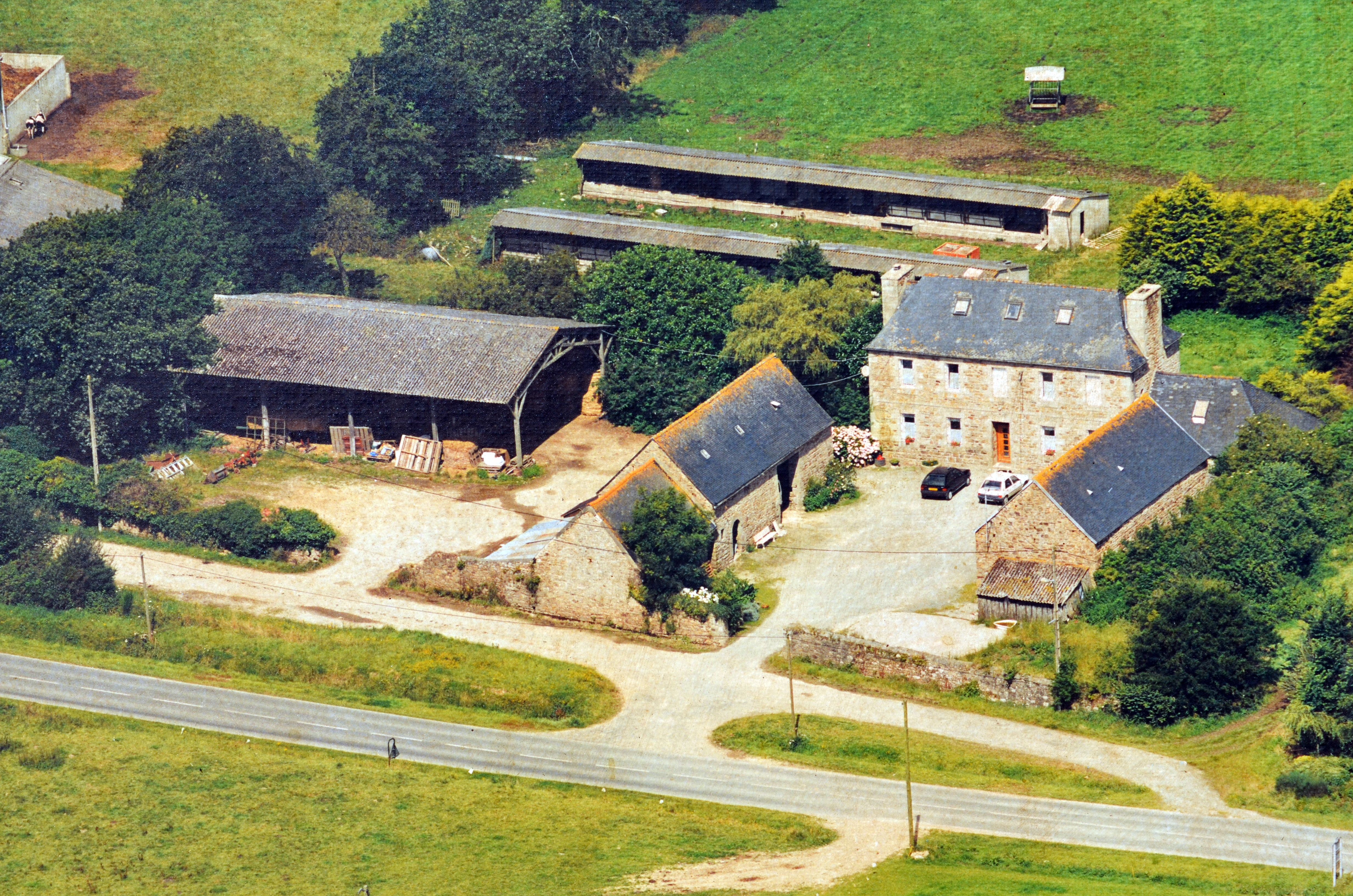 Kermaria-Sulard, Prat Louët : vue aérienne oblique de la ferme (photographie de 1999-2000). La route de Kermaria-Sulard a été construite sur le site de l'ancien vergerImmatriculation