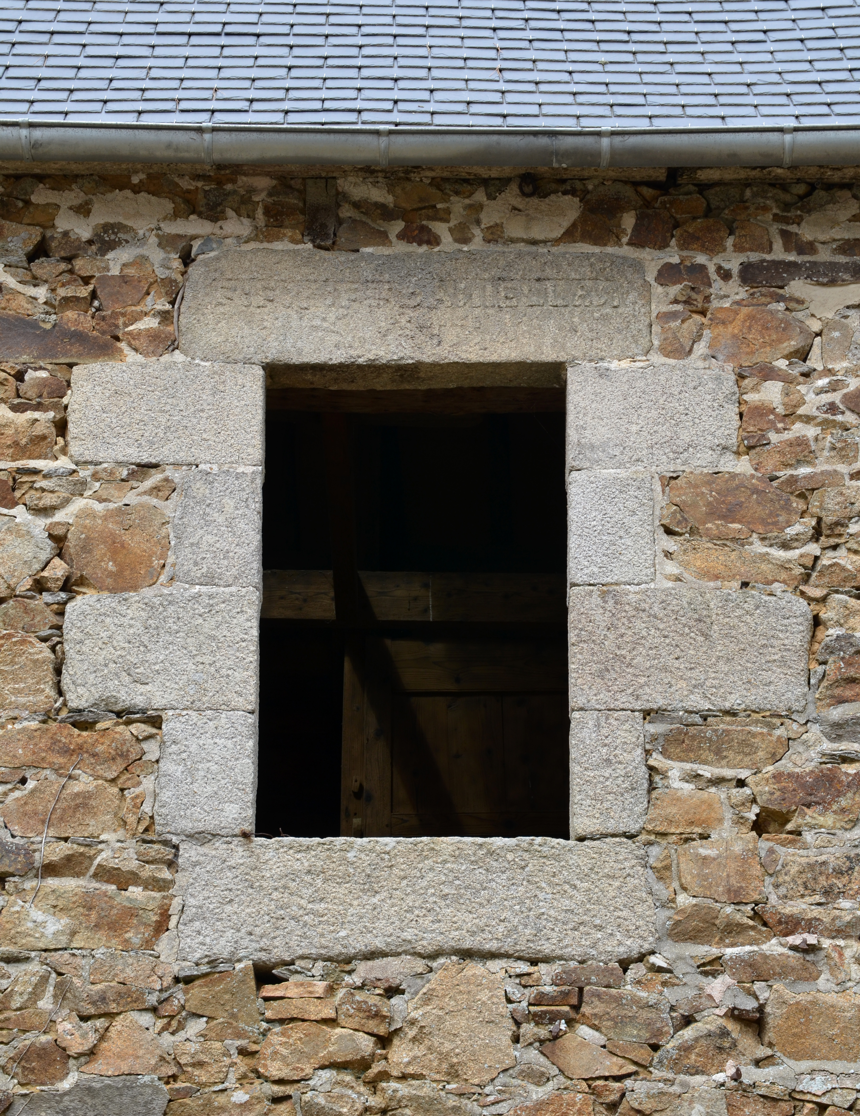 Kermaria-Sulard, Convenant Coz : logis daté 1844, élévation sud, détail de l'une des fenêtres de l'étage. Sur le linteau, on peut lire l'inscription suivante : "FFP F DANIEL L'AN / 1844"Immatriculation