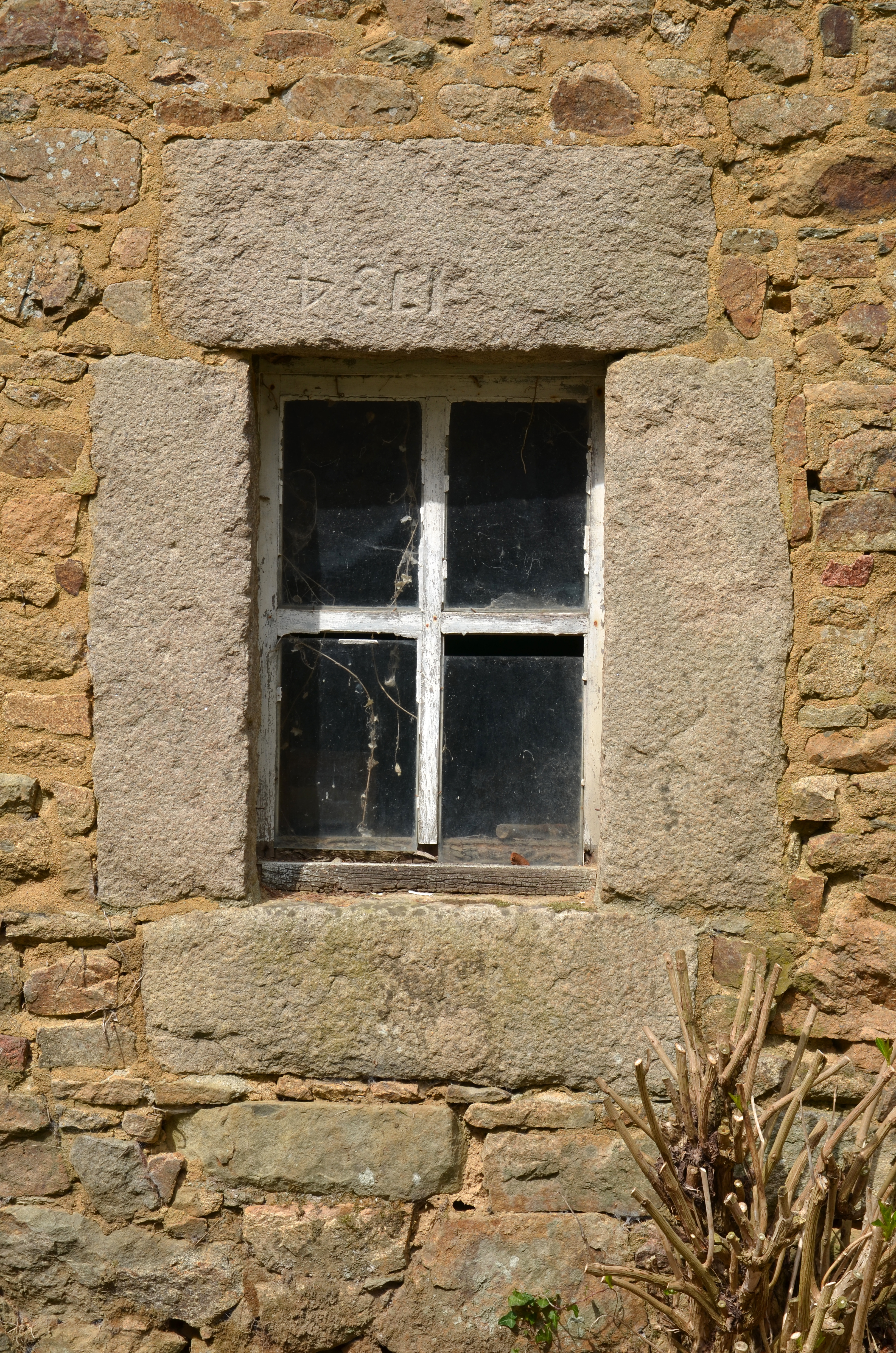 Kermaria-Sulard, Convenant Coz : logis daté de 1850 puis déclassé en étable, élévation sud, détail. Fenêtre datée 1734 (remploi)Immatriculation