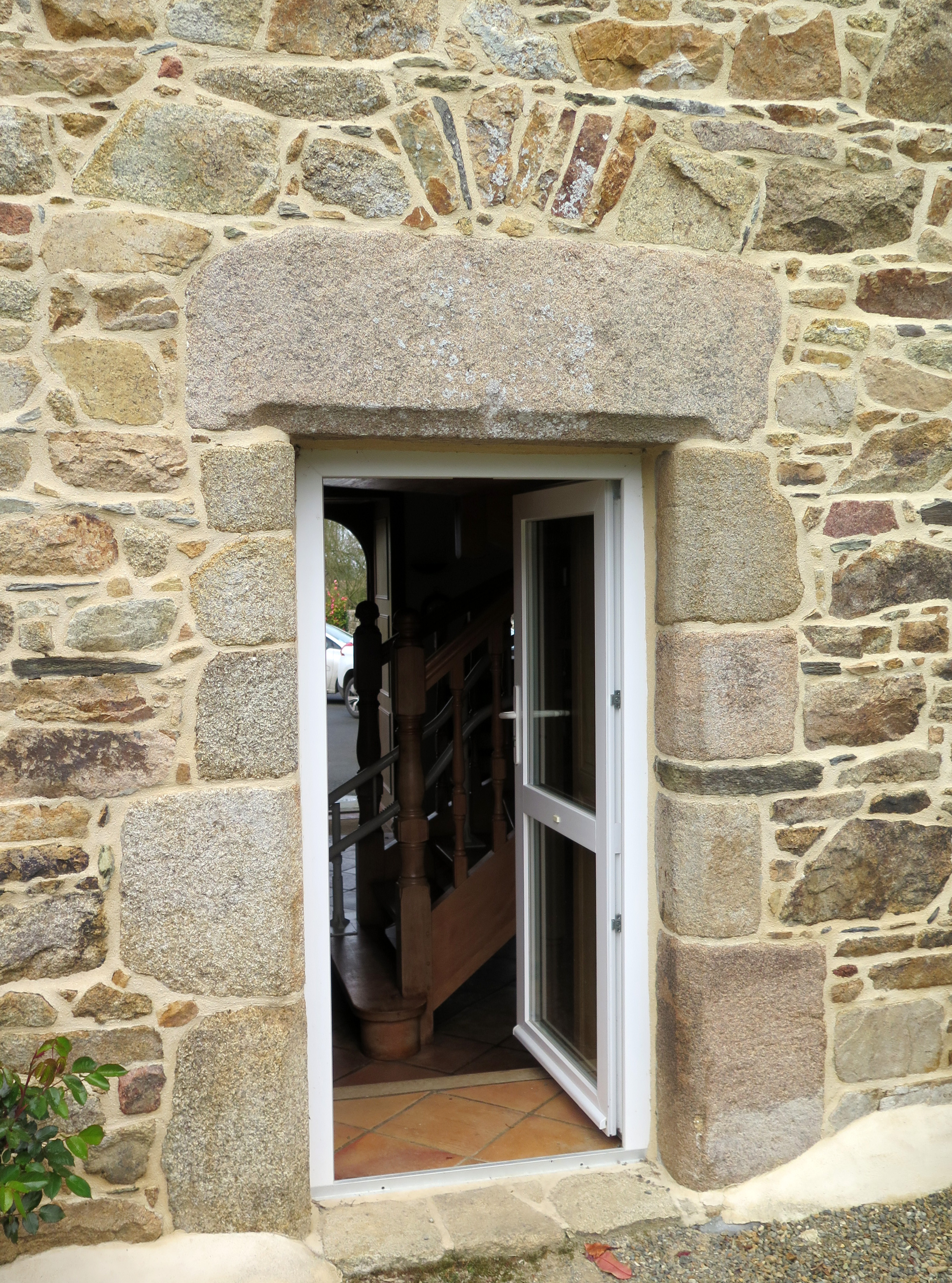 Kermaria-Sulard, Coatalliou : logis de ferme daté par millésime de 1818, élévation orientée vers le sud, porte, remploi d'éléments anciensImmatriculation
