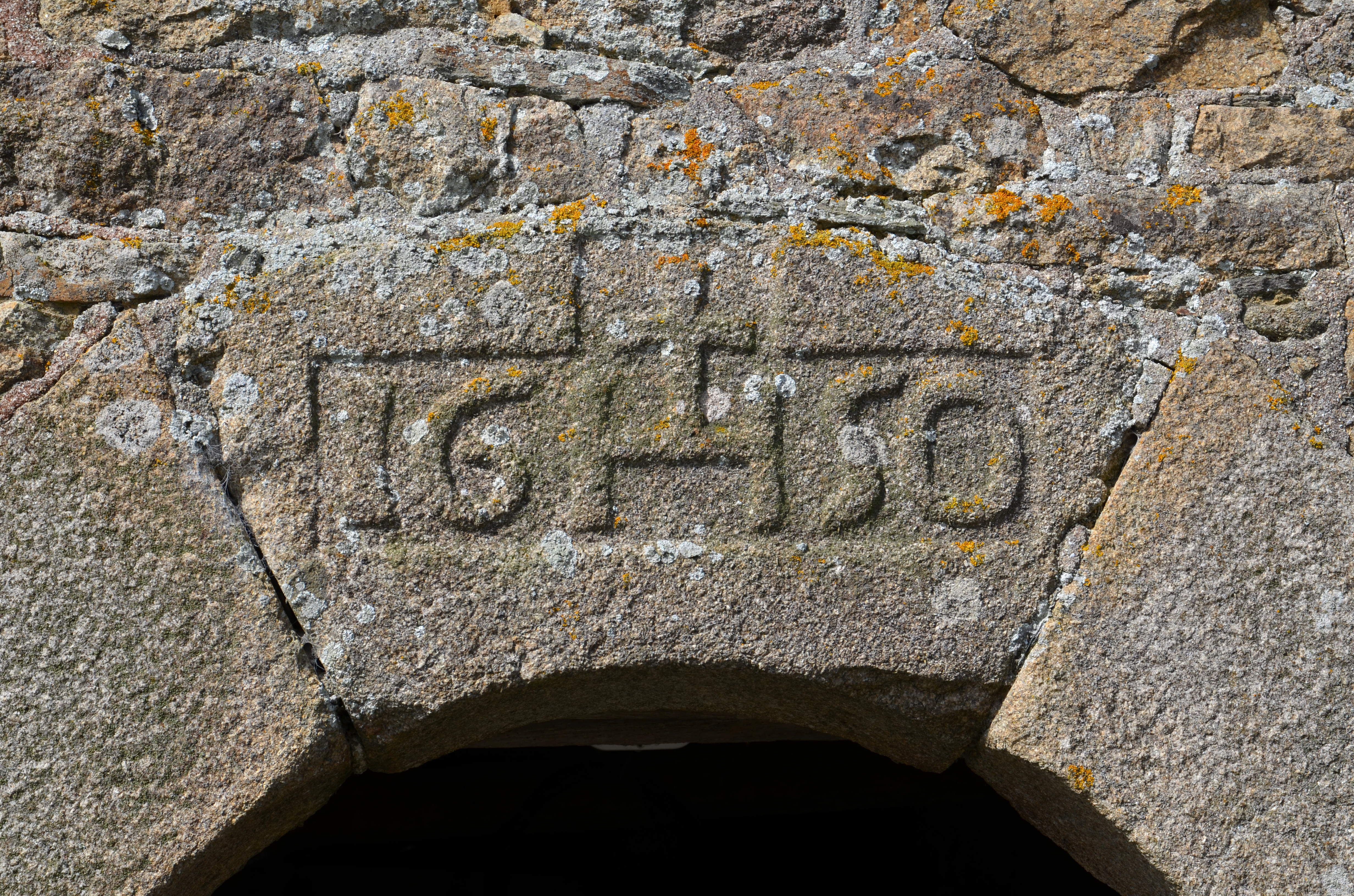Kermaria-Sulard, Prat Louët : dépendance (écurie et grange - remise), porte datée 1650 et surmontée d'un monogramme du Christ (IHS)Immatriculation
