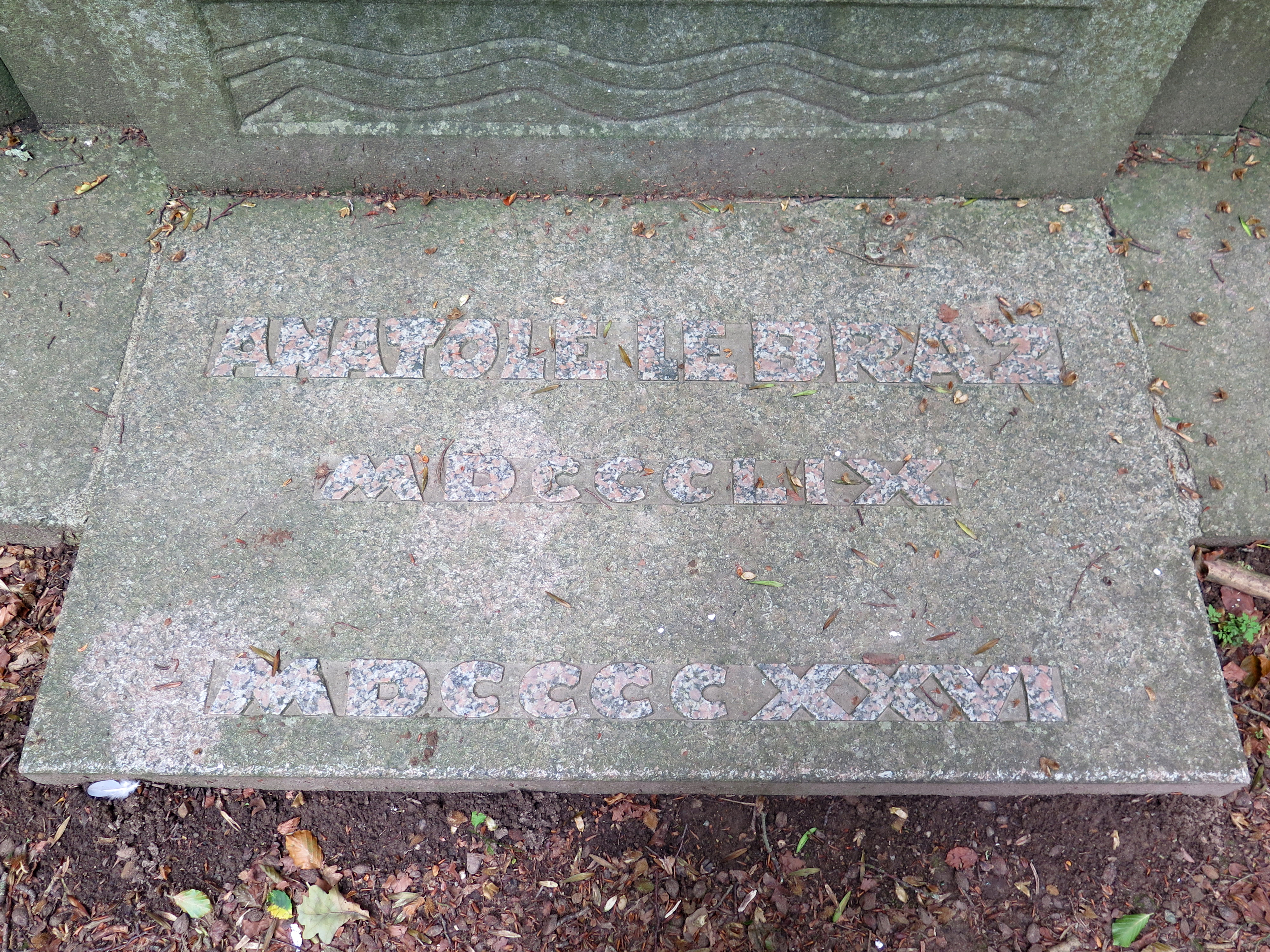 Tréguier, "Bois de l'Évêché" aujourd'hui "Bois du Poète" : détail du monument funéraire et tombe de Anatole Le Braz. Au pied de la stèle, on peut lire l'inscription suivante : "Anatole Le Braz / MDCCCLIX / MDCCCCXXVI"Immatriculation