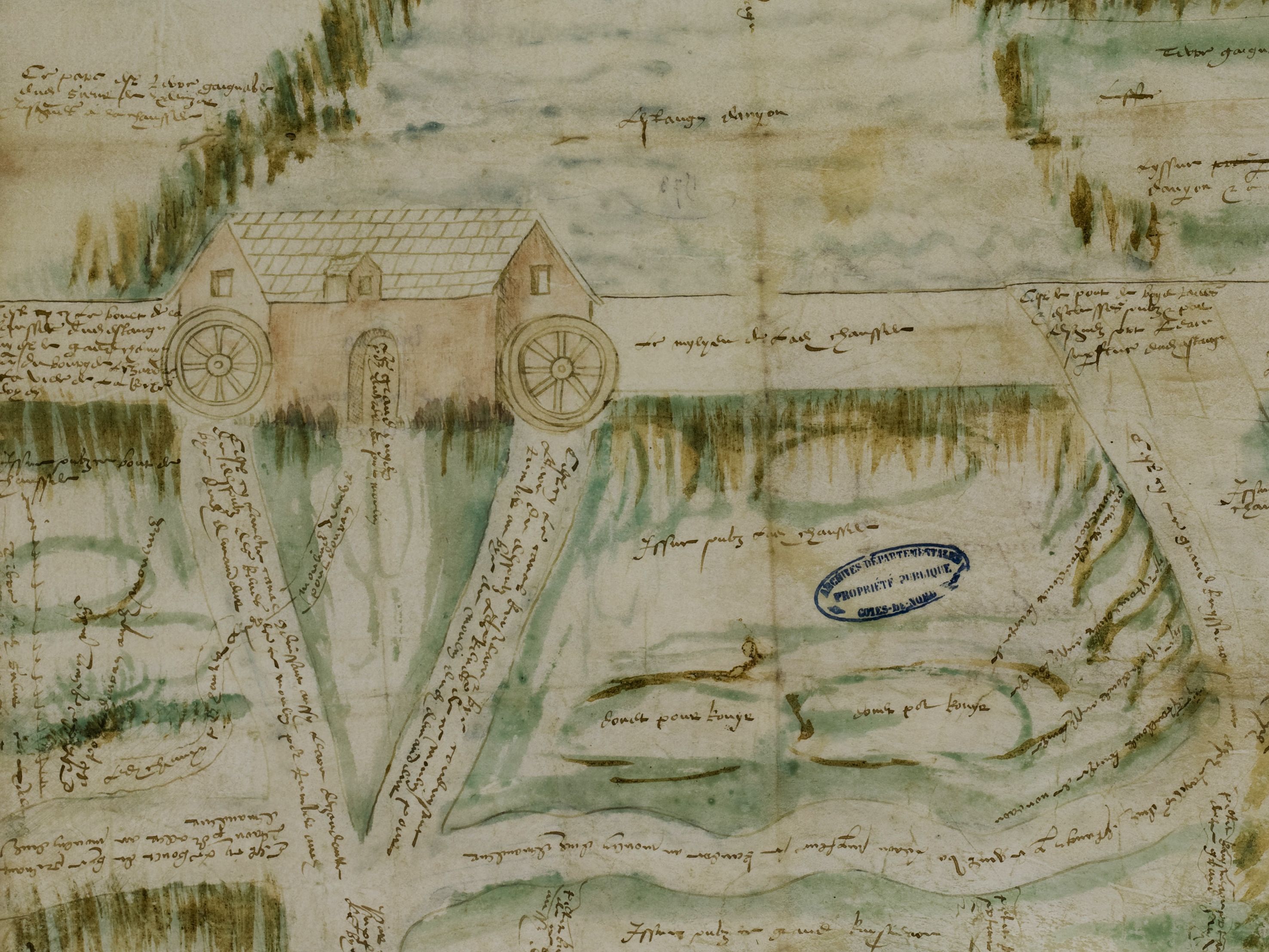 Extrait du plan du moulin Daniou et de ses environs, 1573 (A.D. 22, série 1 E 2870)Immatriculation