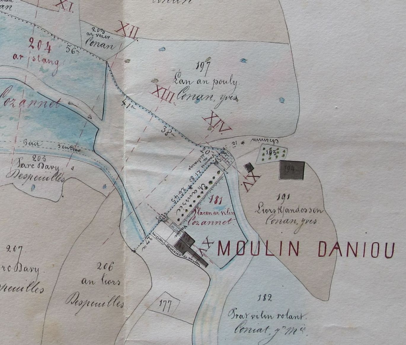 Demande de règlement d'eau du moulin Daniou. Extrait du plan dressé par l'ingénieur M. de la Fribonnière, 1855 (AD 22, série 7 S art 48)Immatriculation