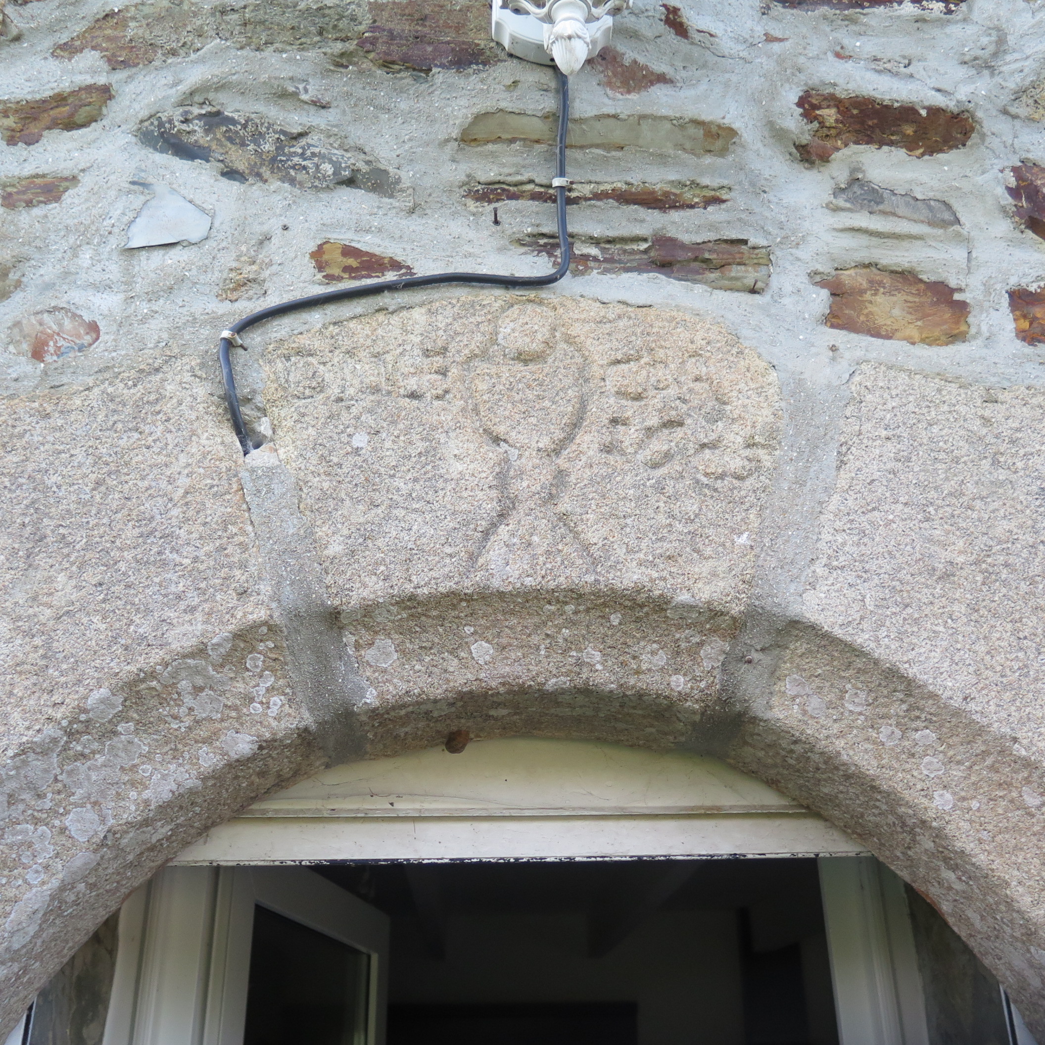 Kernaudez. Ancienne maison de prêtre datée 1605. Détail du linteau avec calice sculpté symbole de la prêtriseImmatriculation