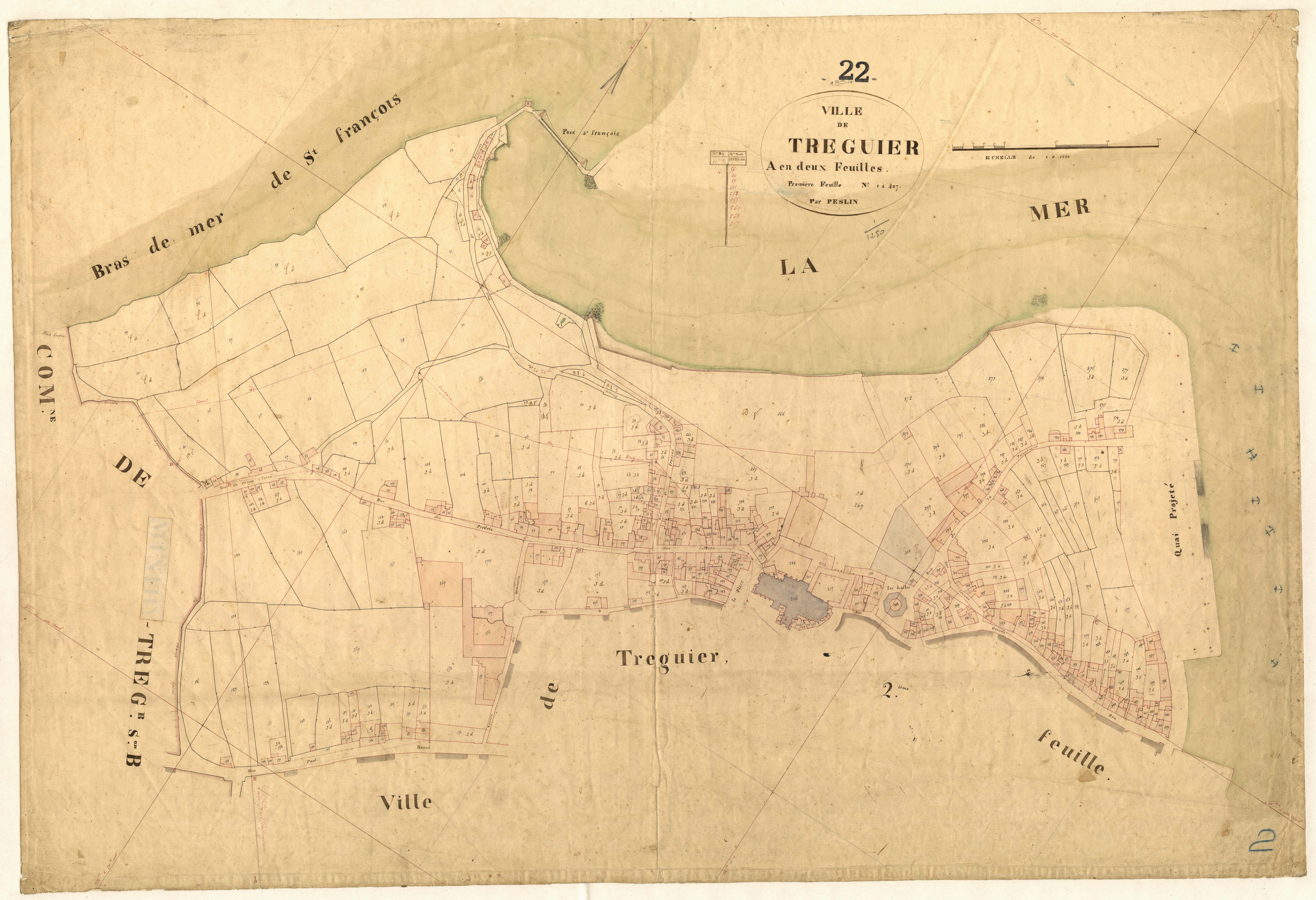 Tableau d'assemblage et plans parcellaires de la commune de Tréguier, 1834.