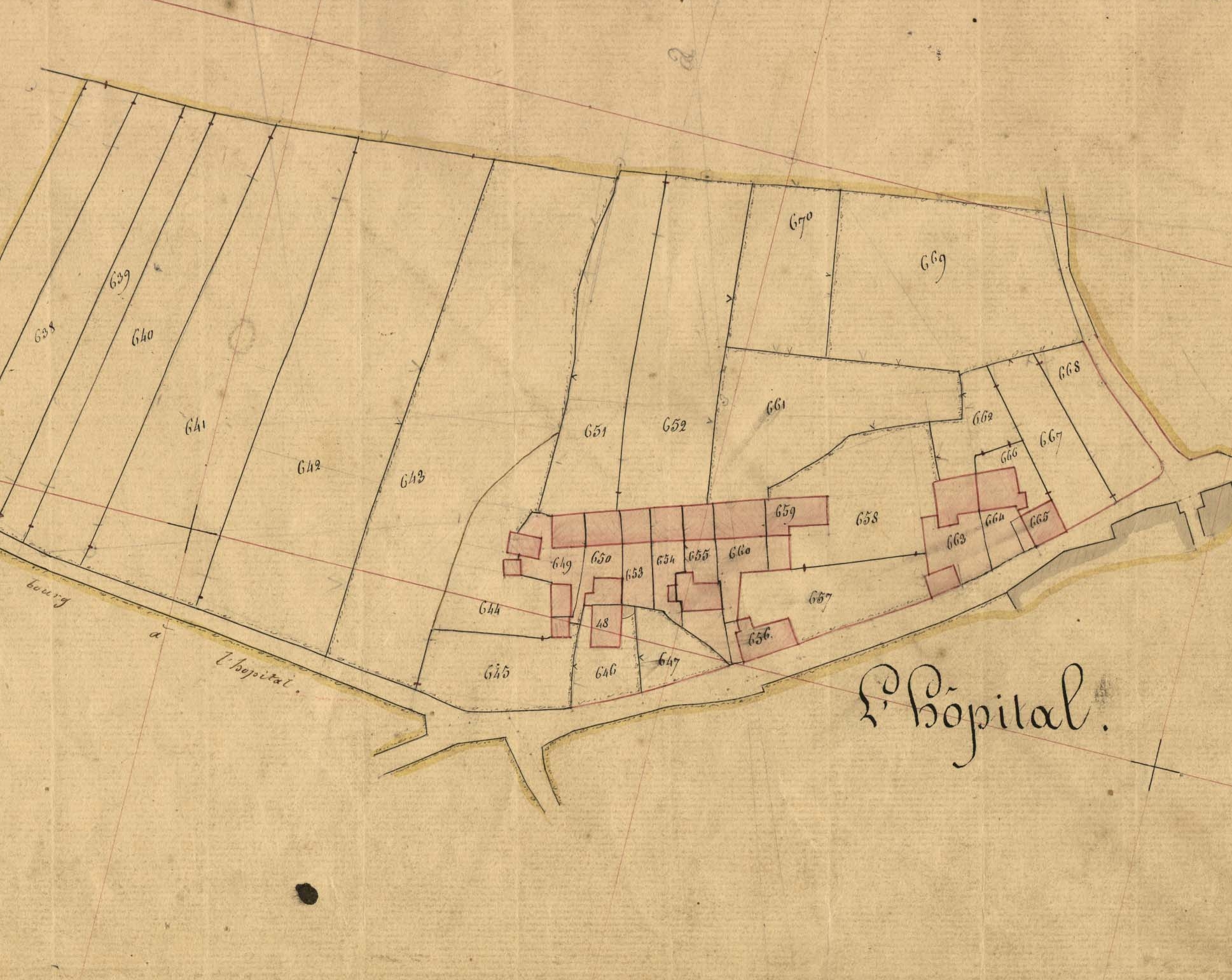 Extrait du cadastre de 1844, section M, partie nord-ouest de l'HôpitalImmatriculation