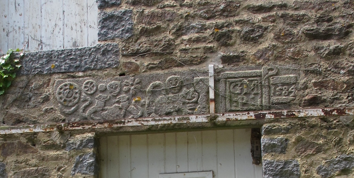 Le Breil, décor : linteau avec marques et inscription 1577. Le calice indique une maison de prêtreImmatriculation
