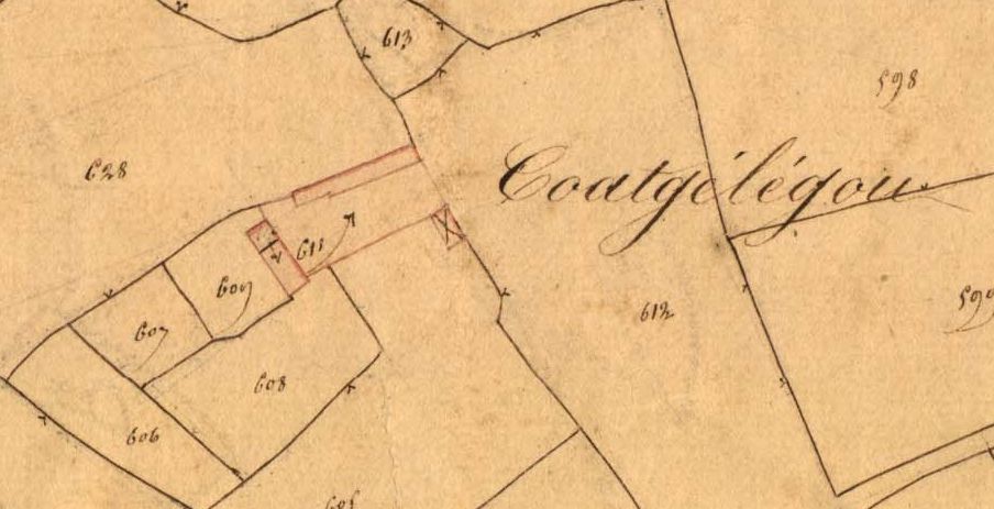 La ferme de Coat Jélégo en 1834. Extrait du cadastre ancien, section c2 (A.D22, série 3P33/2)Immatriculation