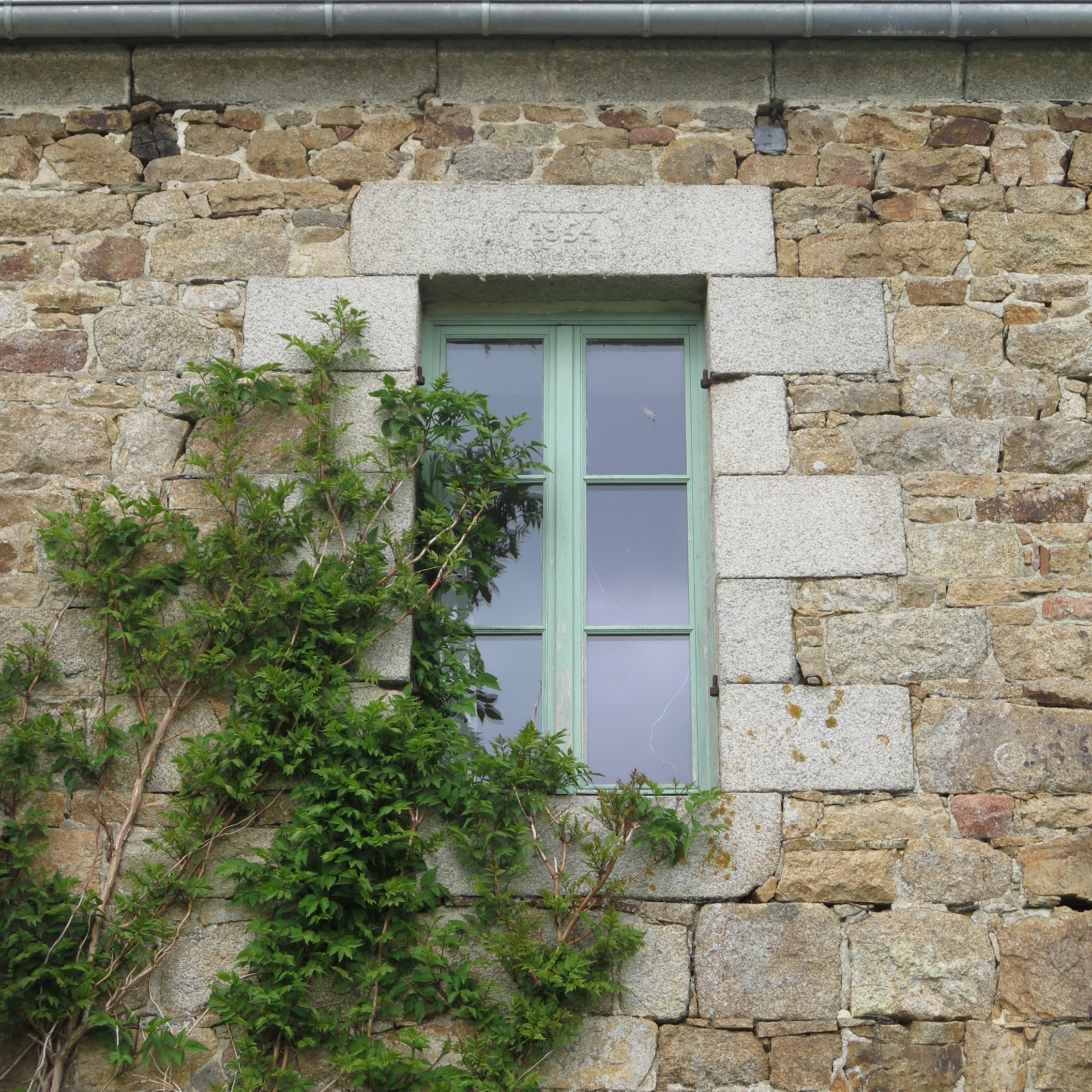 Ancien manoir de Kergoniou, Kergoniou (Camlez) - Logis. Détail de la fenêtre avec date porté sur le linteau.Immatriculation
