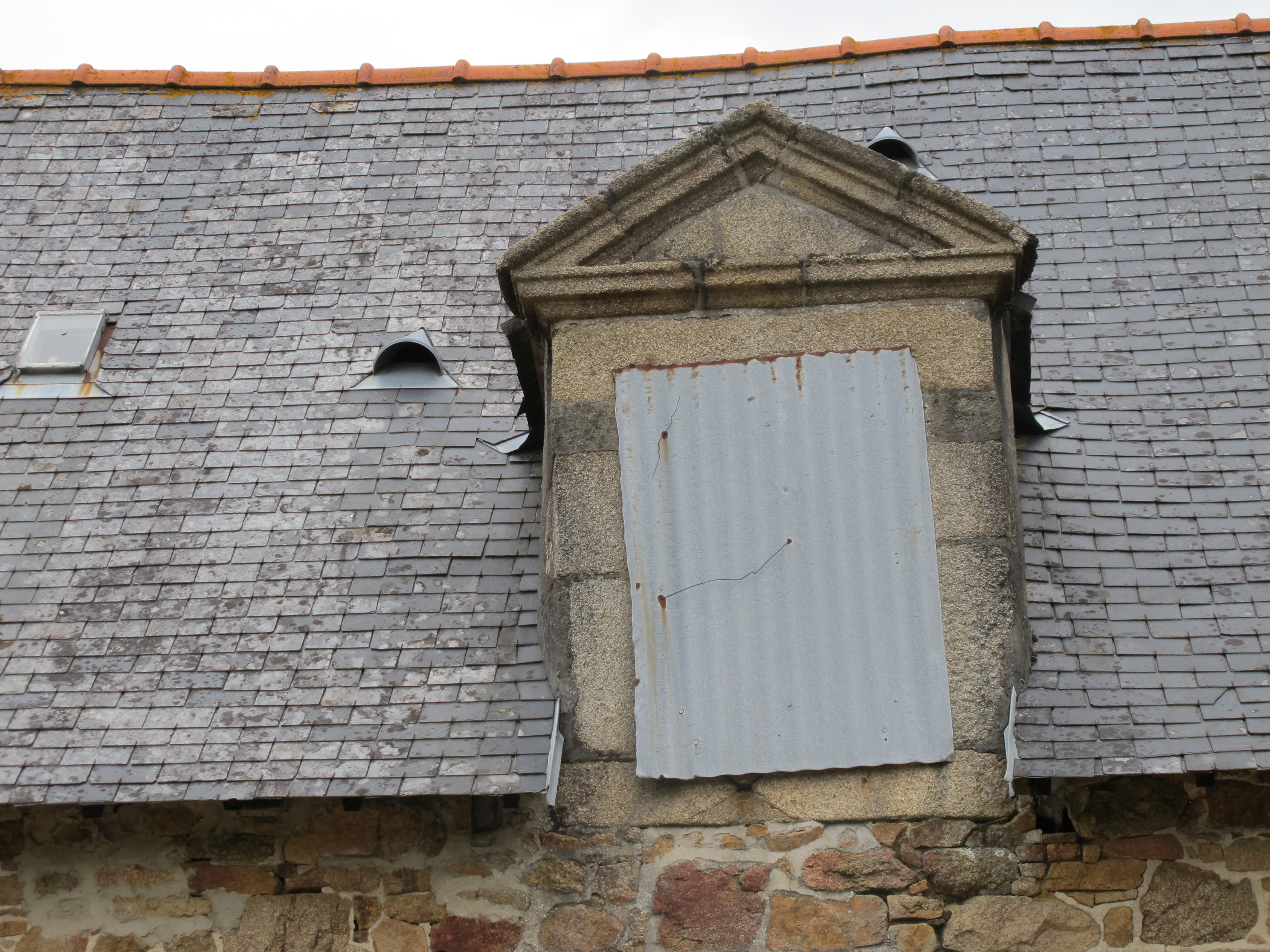 Étable. Détail d'une lucarne en pierre de taille à fronton triangulaire.Immatriculation