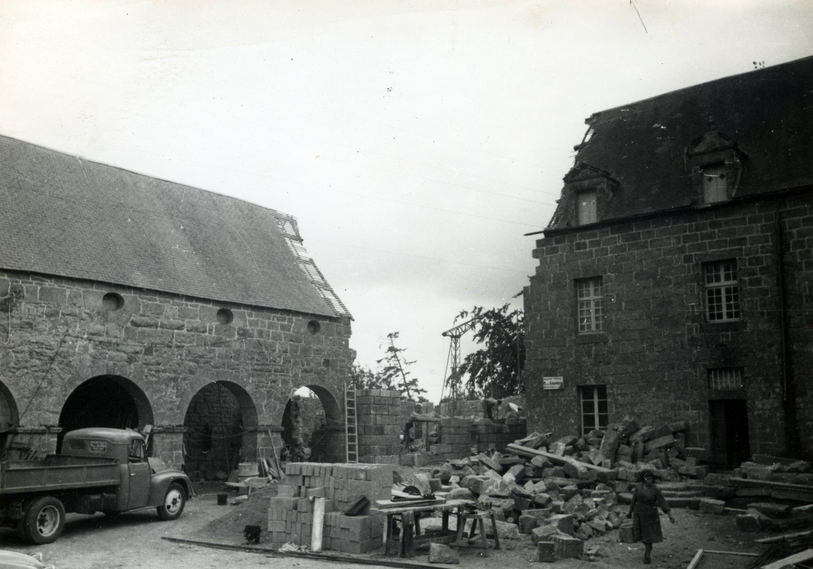 Château de Kerham (Camlez) - Camlez, Kerham : cour, destruction du pavillon sud du logis, ancienne photographie (1960)Immatriculation