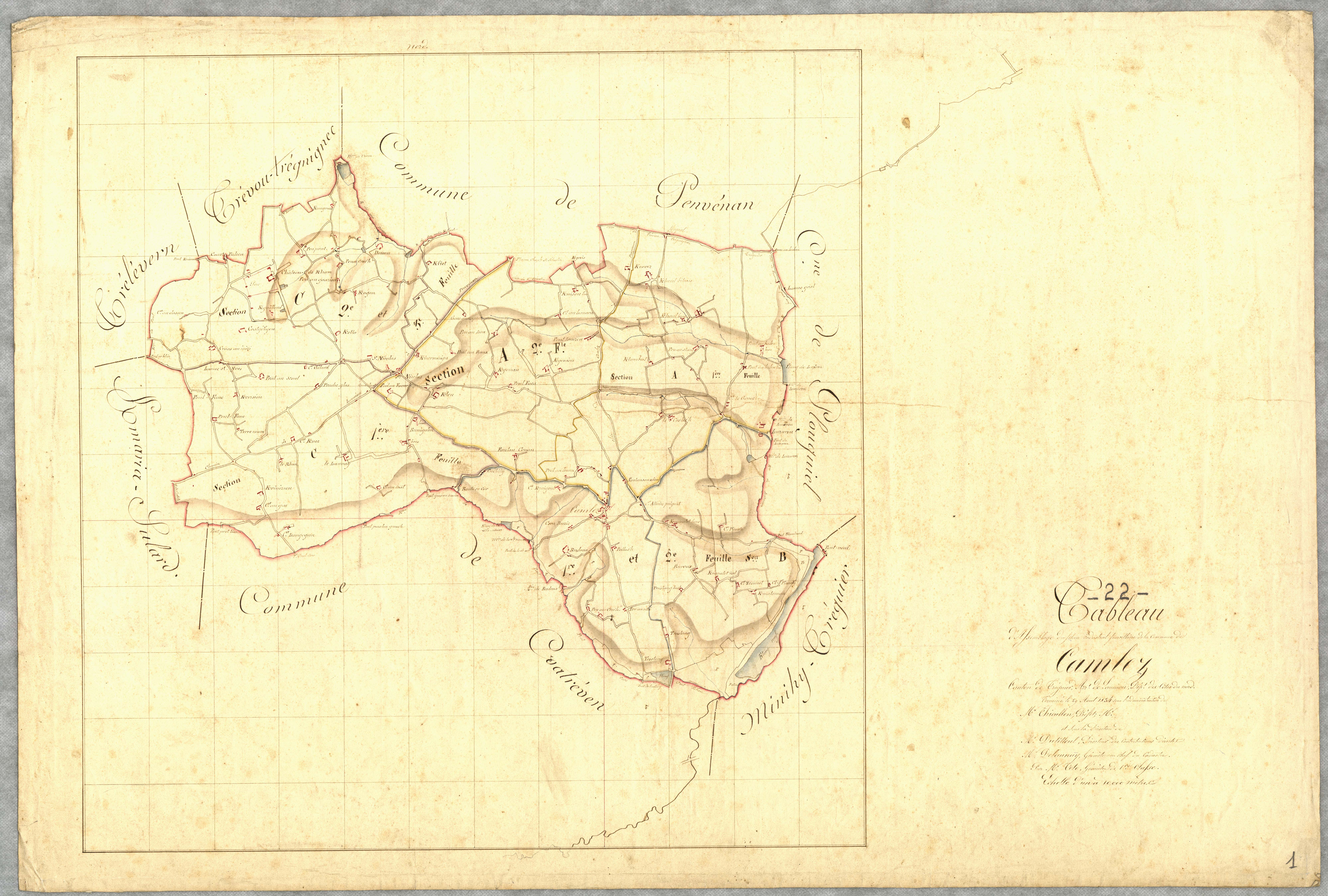 Présentation de la commune de Camlez - Tableau d'assemblage du plan cadastral parcellaire de la commune de Camlez (A.D. 22, série 3P 33/1)Immatriculation