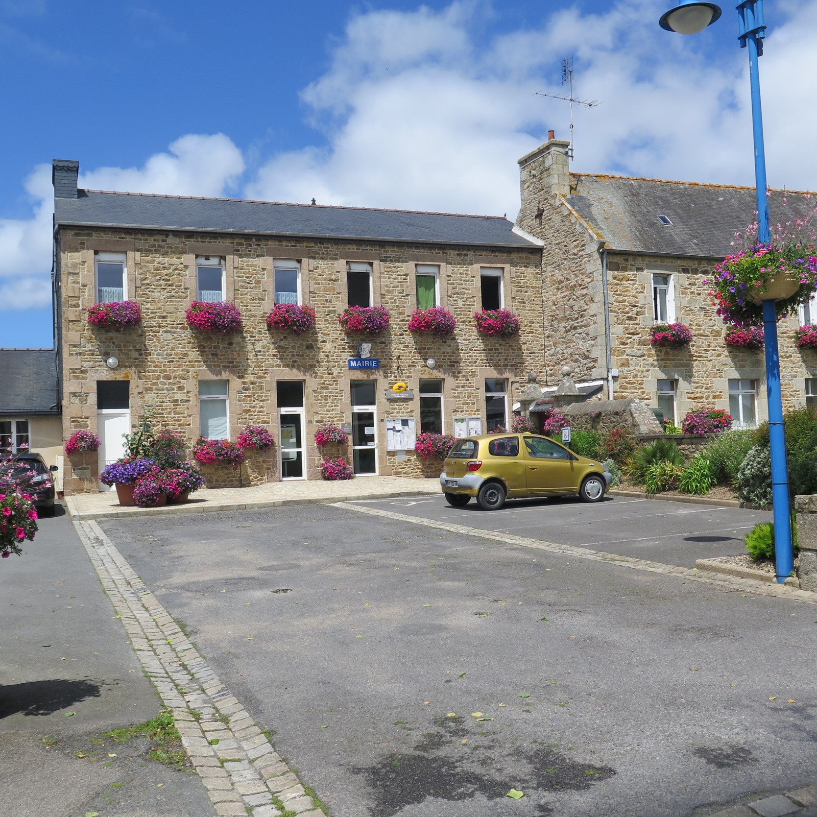 Présentation de la commune de Camlez - le bourg, place de la mairie. Ces bâtiments accueillaient la prémière école publique de garçons.Immatriculation